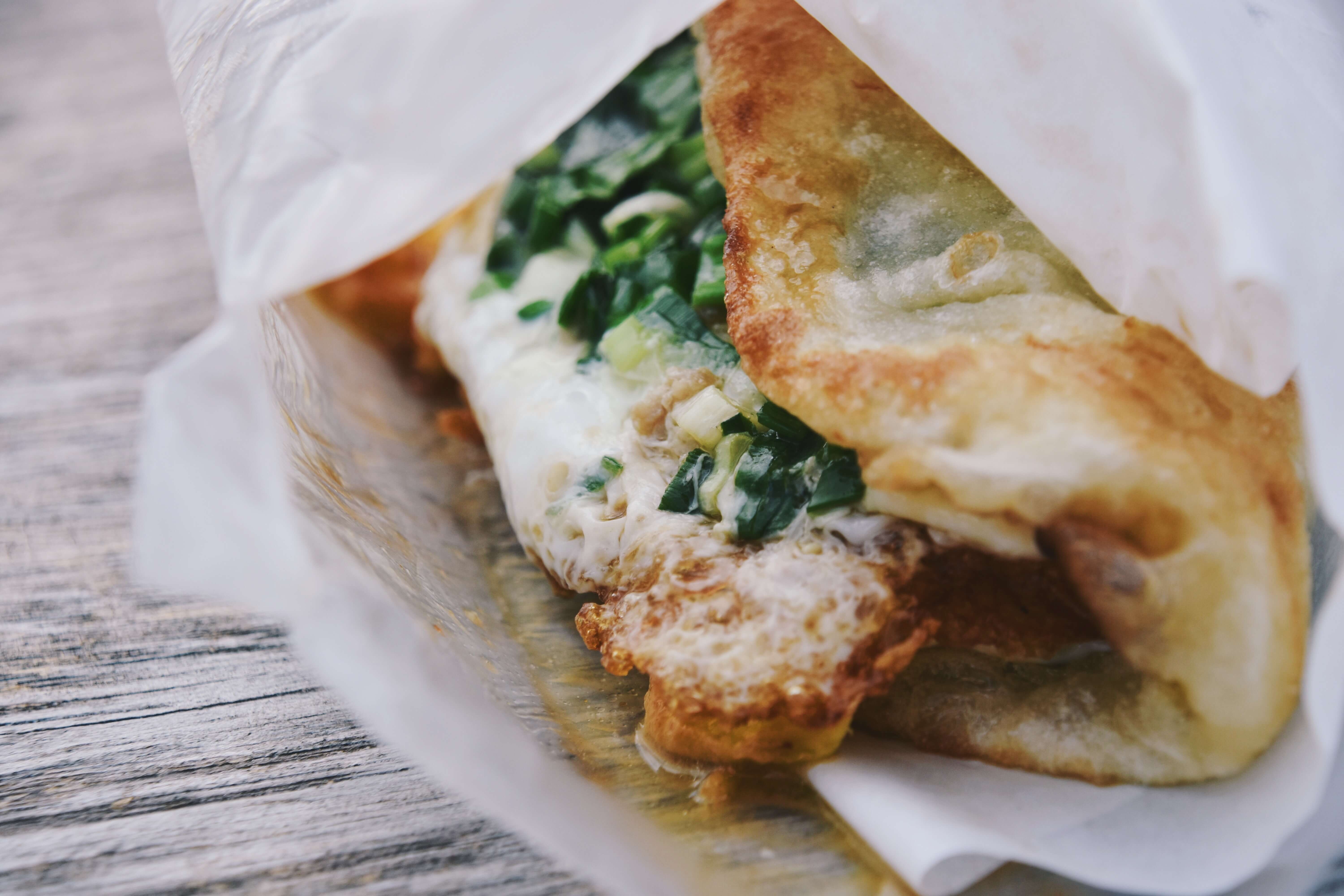 近幾年流行「蔥抓餅」,出外旅遊,嘴饞了,買一份被鏟子敲敲打打至酥軟的蔥抓餅,夾一顆蛋在餅裡,擠點油膏和辣醬,撒上些許胡椒粉,頓時幸福洋溢。