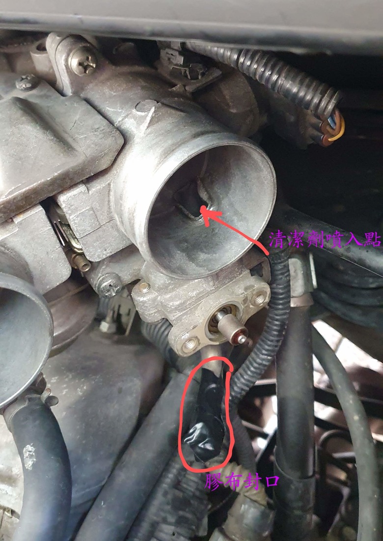 這次是做簡單的清洗, 主要是依第1支影片的方式進行, 不過為了使清潔劑浸泡轉軸, 所以我將下方的排水管用膠布封住, 浸泡20分鐘後才拆封排掉清潔劑, 然後使用快乾的WD-40再做一次噴洗。清洗前轉軸確實有些卡頓, 清洗完就轉得很順了, 所以我認為問題應該會有改善, 萬一無效, 就要依第二支影片的方式進行, 卸下整個節氣閥總成來更換怠速馬達, 並順便清洗整個節氣閥, 到時我還是會自己動手。