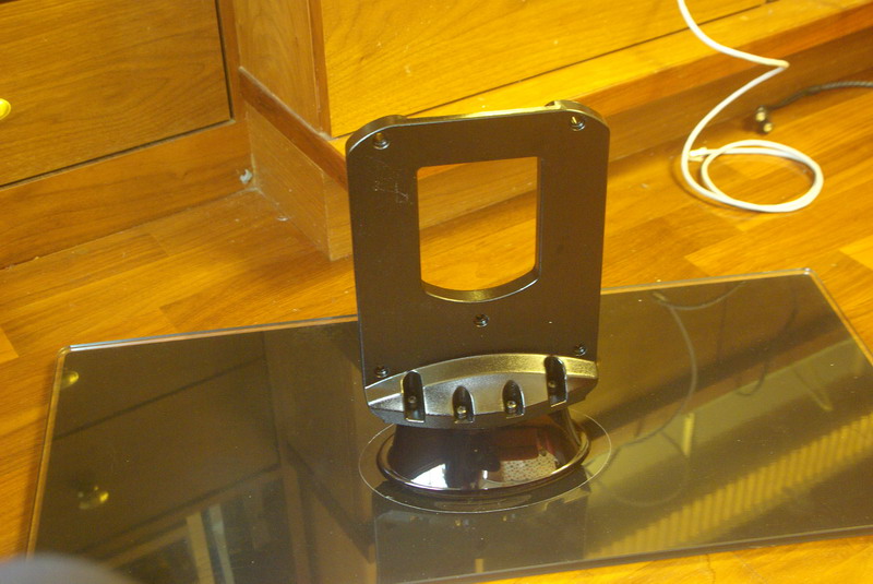 3.腳座分成兩部分,一個是長方形的平面底座,與外框一樣的配色,但以重量來推斷應該是強化玻璃材質。另一個是鐵質的板子,用來和機身連結。