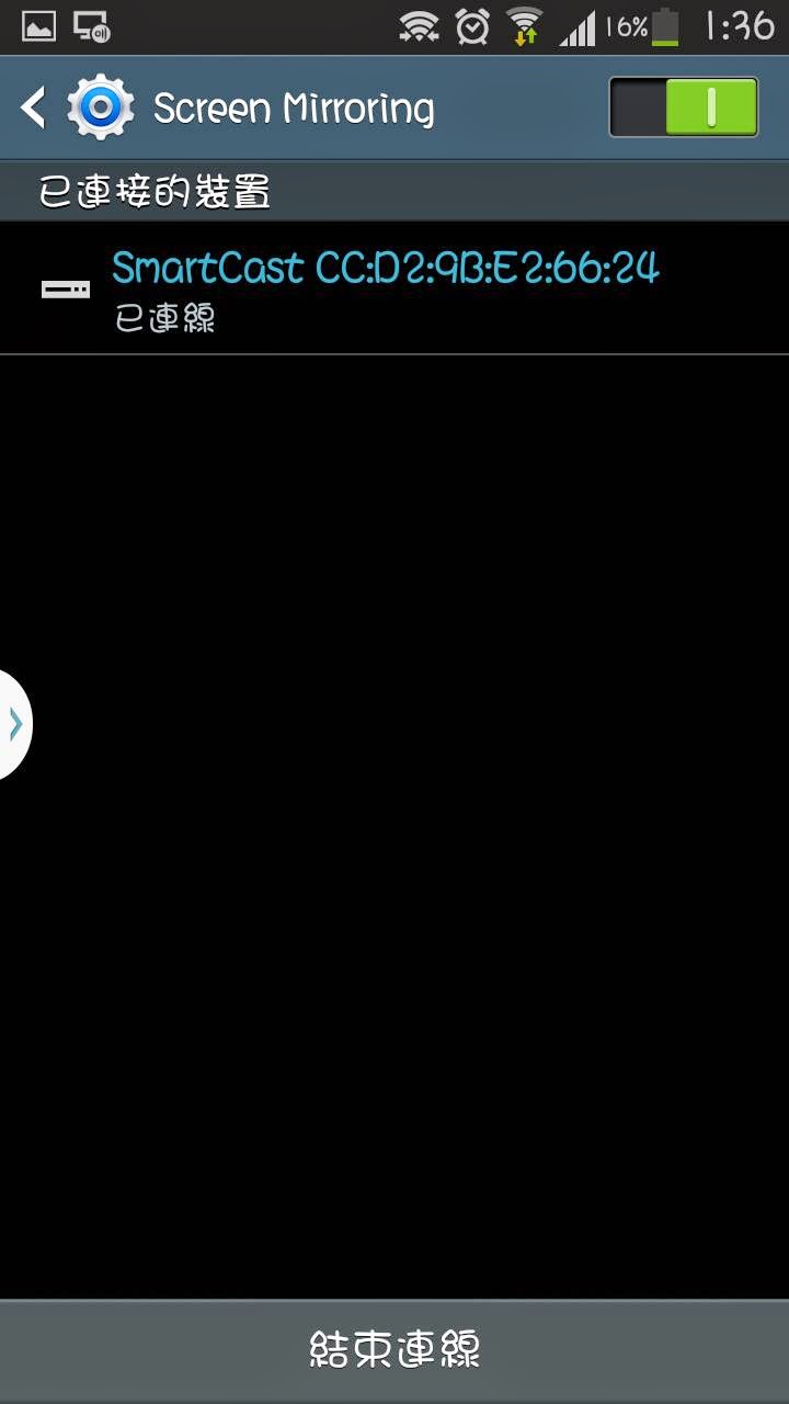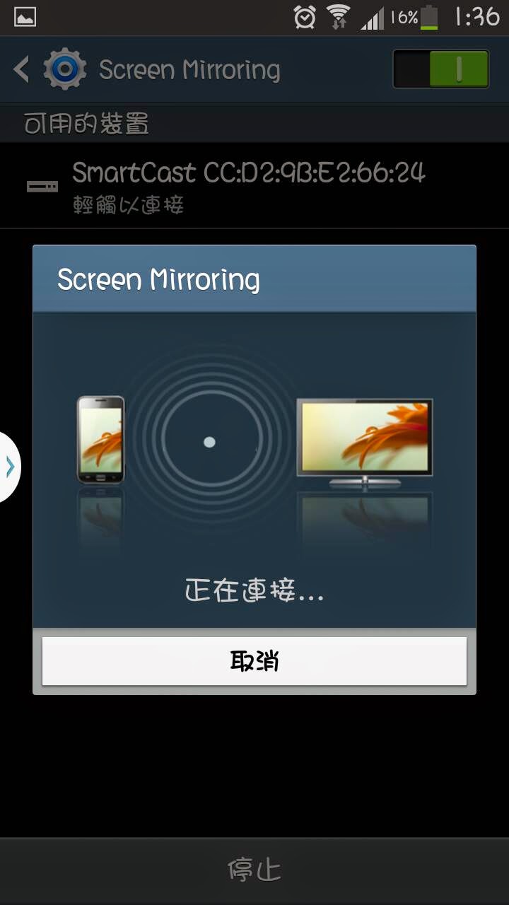 3. Samsung Note2為例:設定 --->開啟Screen mirroring-->找到艾推屏訊號(Smartcast xxx),然後連線,就成功了。