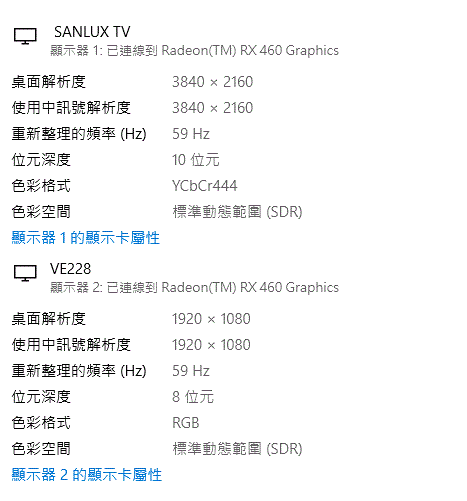 ccc0121 wrote:接電腦只能跑24HZ...(恕刪) 用大大的方法雖然說成功但是也是很不合理我要接2個螢幕才能正常使用顯卡先接1個普通電腦螢幕DVI,HDMI再接4K電視,這樣才能正常使用4K59HZ這樣就等於是用雙螢幕概念..延伸螢幕這樣拔掉電腦螢幕的DVI,馬上黑屏,或雪花無法單一使用4K電視當螢幕可以幫忙測試看看是否單一接電視可行?