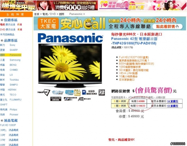 是阿,我也買了一台P42G10W,貨到付款的那家~實付37500,東西送到一樓後就跟你說掰掰,只剩下我跟我姐兩人扛上樓然後趕緊把之前舊的37" CRT換掉喔~差很多,差很大~整個空間就出來然後我媽回來後,看到螢幕愣了一下,說"阿以前的那台顏色比較好看啦",嘮叨了一下接著坐下來就窩著看電視不說話了 = ="不過第四台的品質好像很差耶...看起來都霧霧的不知道有什麼解決的方法(抱歉還沒爬文...請鞭小力一點)謝謝~