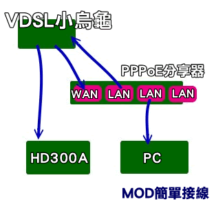 90401076 wrote:不知道有沒有大大向熊...(恕刪) HD300B MXD+上網 網路方式例如分享器 IP 是 192.168.1.1 有開啟 DHCP 192.168.1.1~192.168.1.100 使用HINET FTTBHD300B >> FIX IPIP位置 : 192.168.1.20MARK :255.255.255.0GATEWAY:192.168.1.1DNS:168.95.1.1----------------------------------------------------------如果VDSL支援 PPPOE+DHCP只要將HD300B設為 DHCP 就能 上網+MXD