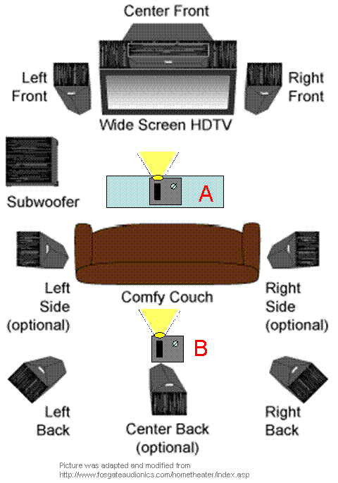 -->選擇A方案:例如DV-10的架設方式為前者,好處是內建DVD player所以省下了拉色差線的麻煩(而內部直接輸出訊號給投影端也不會有訊號損失的問題),但是DV-10的音訊則必須由光纖拉到環繞擴大機。如果是採用其他的投影機則必須由DVD player拉色差線提供訊源給投影機,光纖到環繞擴大機。總之都會有一條線從前端訊源拉到投影機端。如果視聽室有地毯,則可以將這條線藏到地毯下,預先拉到投影機擺放的位置。如果不是專用的視聽室,在客廳中間出現一條線總是有礙觀瞻吧~