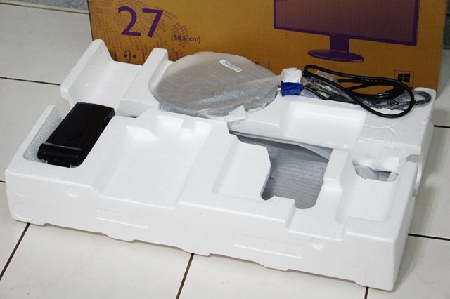 裡面的物品,包括GW2760HS螢幕本體、底座、螢幕支柱、電源線、D-SUB連接線、3.5mm喇叭線、簡易說明書、快速安裝手冊與安裝光碟。