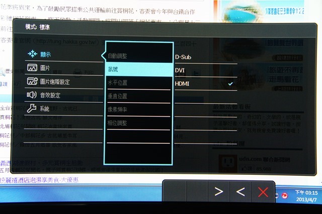 以我這台試用機來說,OSD選單項目從左到右分別是圖片模式、訊號、音量調整、功能表。