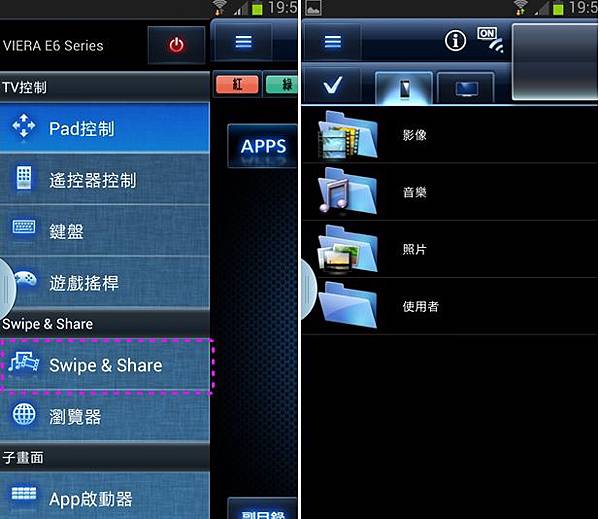 想要把手機裡的檔案傳輸到電視上時 只需要點選Swipe&Share 然後找到手機裡頭的檔案就可以囉