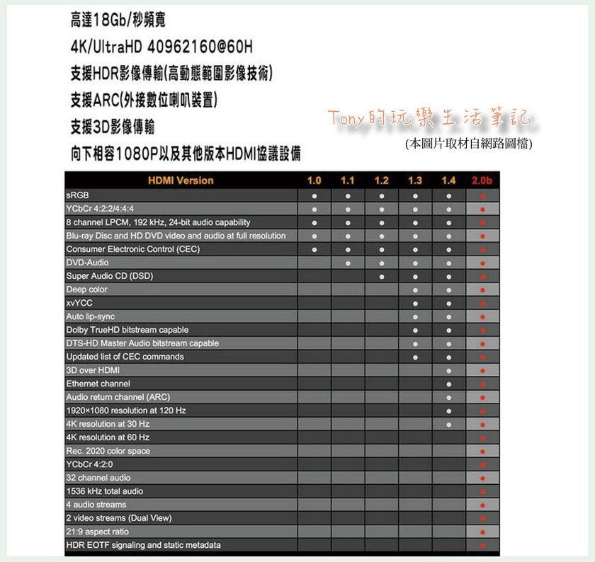 從HDMI 1.0版本到 HDMI2.0版本,可以看到每個版本之間的差異是滿多的