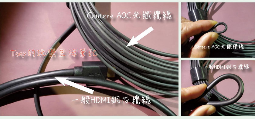 右邊則是兩條線的彎曲半徑比較。這樣看就知道【Centera HDMI 2.0 AOC光纖纜線】的彎曲半徑真的很小,這在我拉線佈線上,真的太好拉線安排了,一點都不怕會突出牆邊去踩到