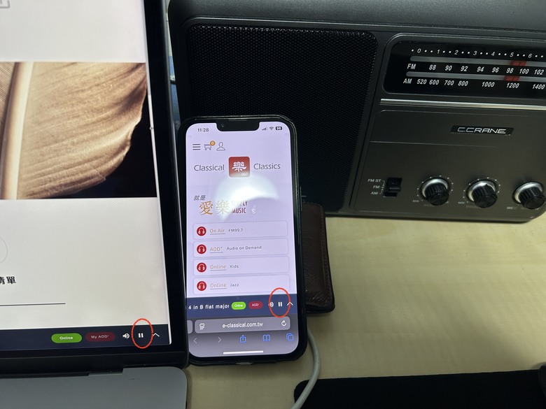 不過我剛才地震完試了一下,用筆電與手機兩個裝置一起收聽,是可以的。(後面那台是桌上型收音機)