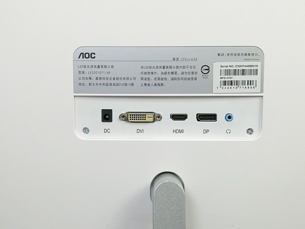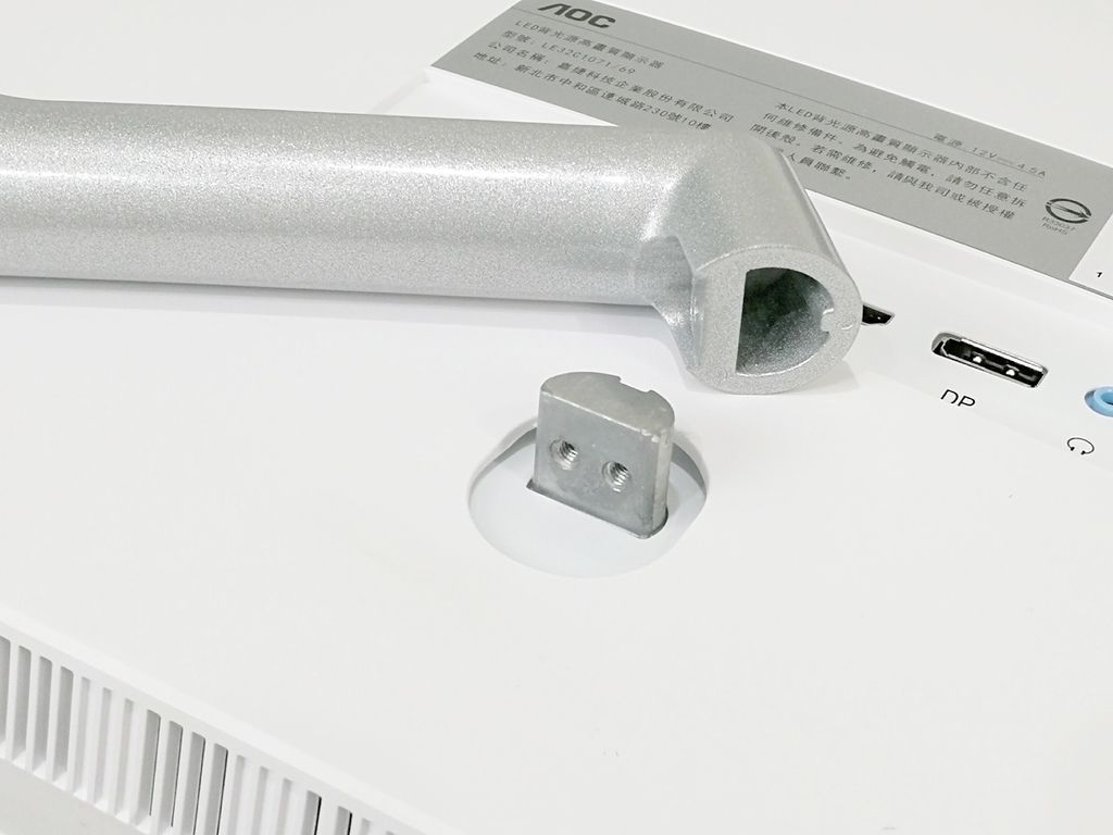 AOC 32吋取面VA螢幕 (LE32C1071/69)的底座腳架是採用鋁合金材質,搭配白色機身設計,腳架採用銀色亮面處理,管壁厚質感不錯。