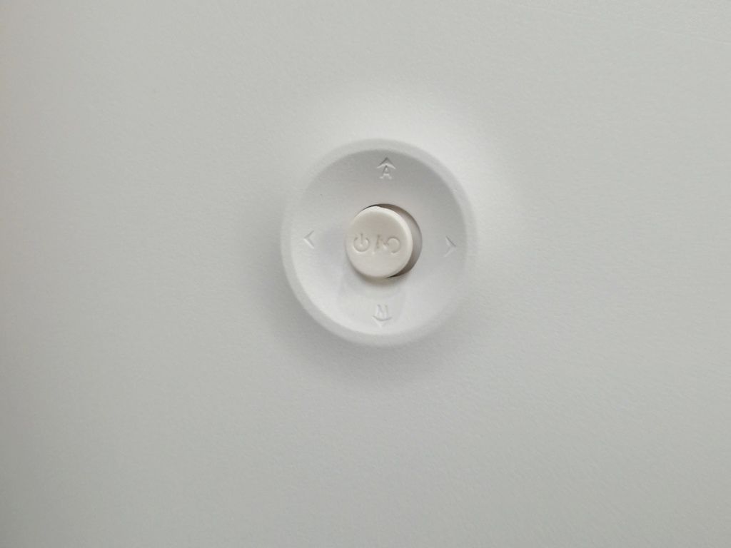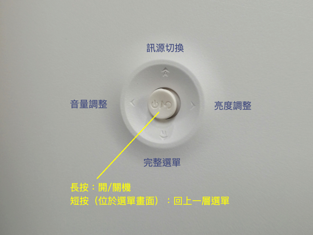 長按中間按鍵就可以開/關機,面對螢幕方向操作,向上推可切換不同訊號源(DVI / HDMI / DP),向左推可調整畫面亮度,向右推可以調整音量,向下推則可以進入完整功能選單。