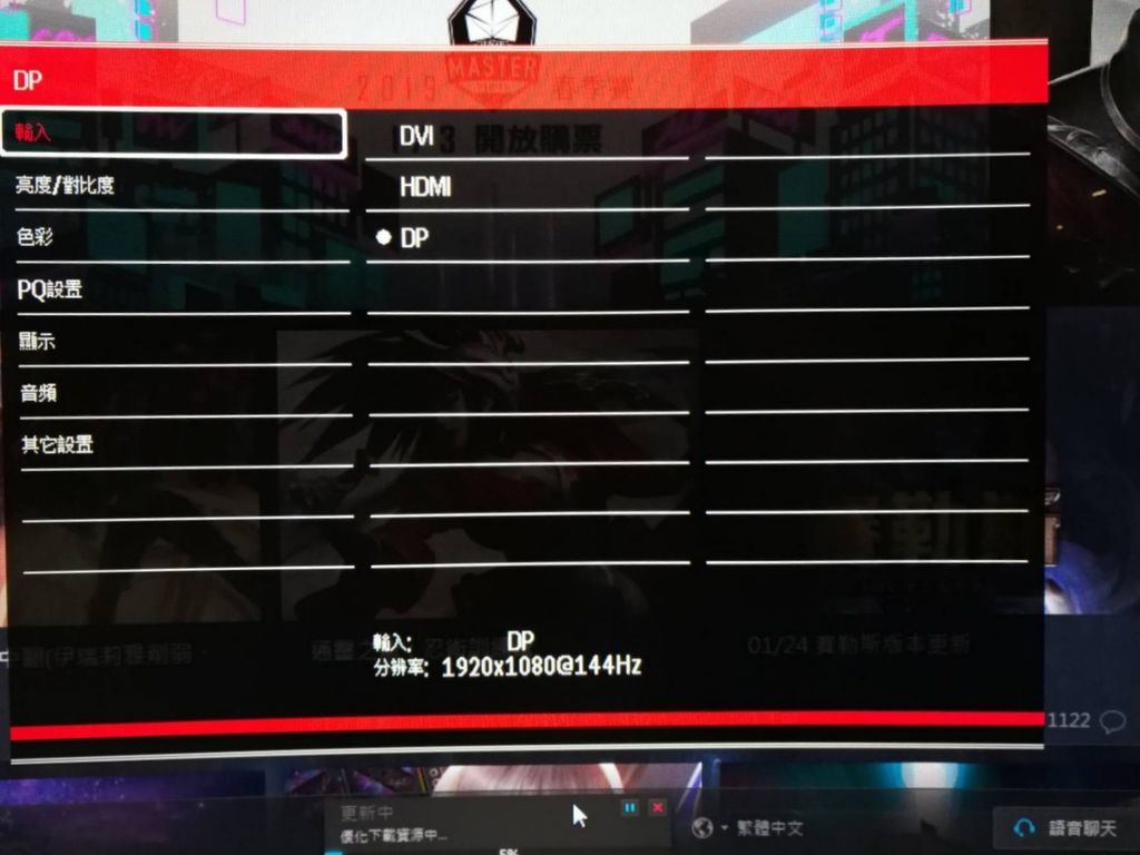 下方會顯示,目前輸入源的畫質,目前使用DP,透過電腦顯卡設定可以切換至1920x1080 144 Hz。
