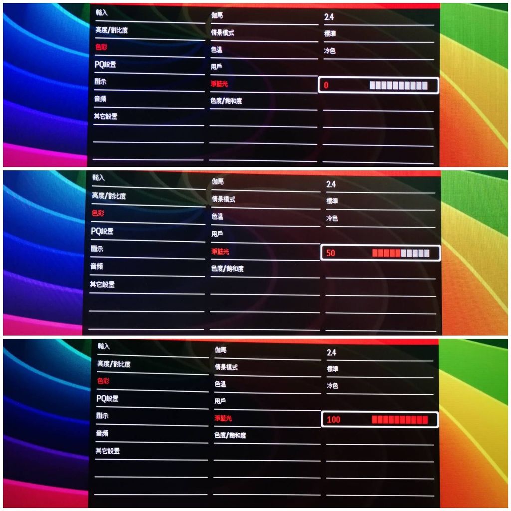 功能選單中,有項AOC產品的特點--濾藍光功能,透過阻隔藍光的等級(0/25/50/75/100),可調整到眼睛舒適的等級。