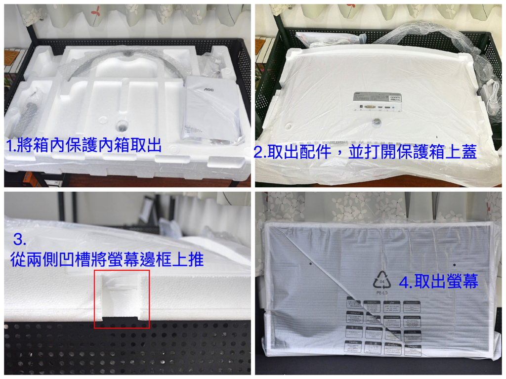 包裝盒上方,有簡易的開箱指引,取出內箱>取出配件>打開上蓋>取出螢幕。