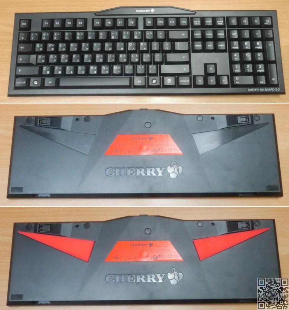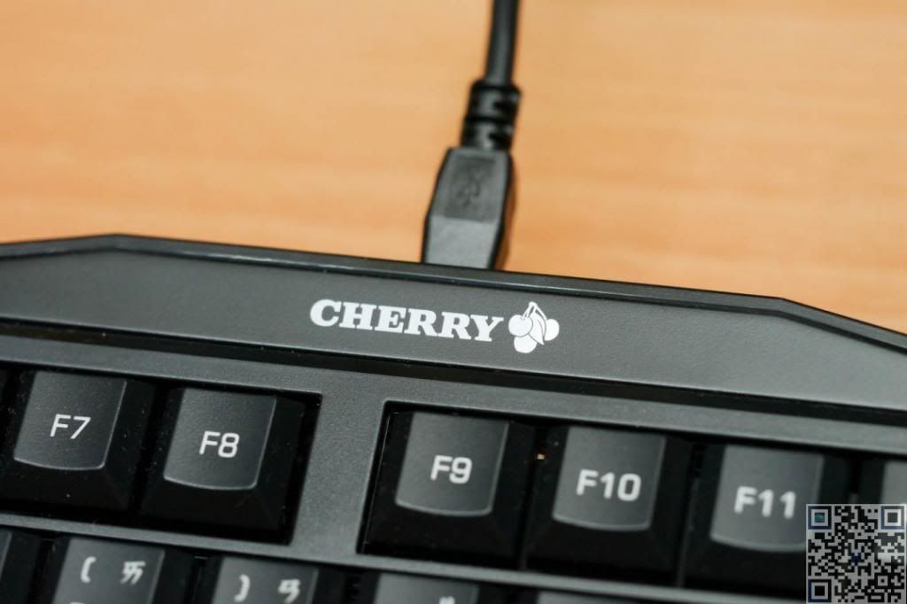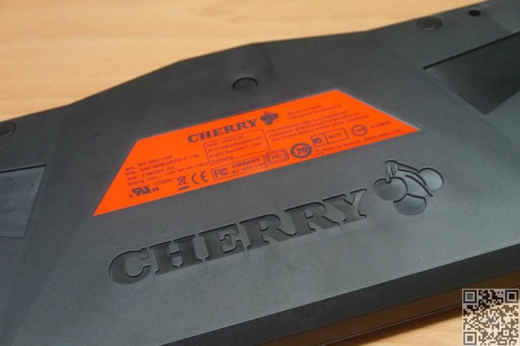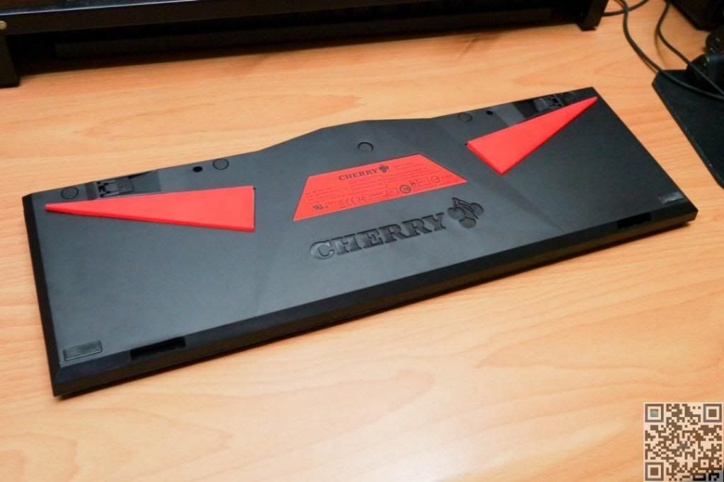上圖可以看到 正面與背面的造型,正面的造型與 Cherry MX-Board 2.0 G80-3800 幾乎無異,但是多了 4個按鍵,以及Cherry 正面 Logo 改為白色的塗裝,背面則是將銘版處,改為紅色的貼紙。
