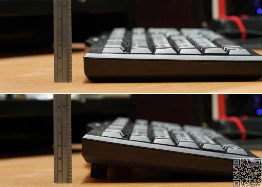 高度真的很薄,未立起立腳大約高度為 2.7cm 左右,立起立腳約為 4cm 左右,把鍵帽給扁平化設計了。