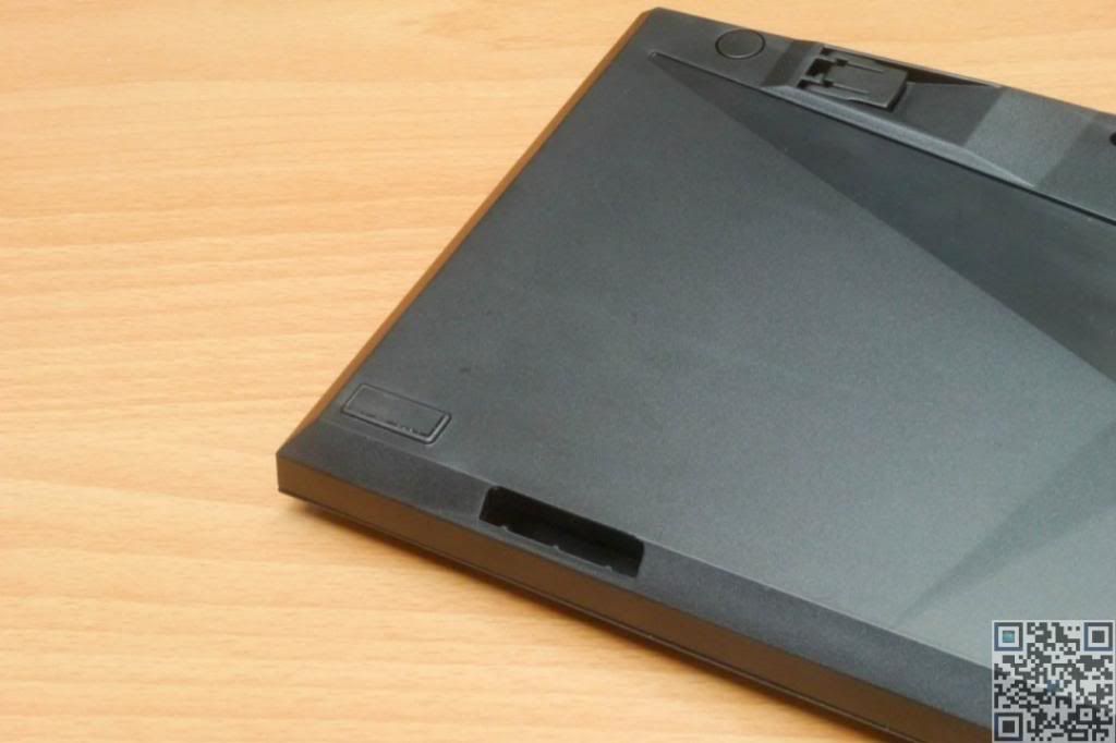 背板兩個角落各有一個止滑墊,鍵盤正下方有個凹洞,為手靠墊,手靠墊可以在 Computex 2013 Cherry 這篇看到,是採塑膠方式扣上。