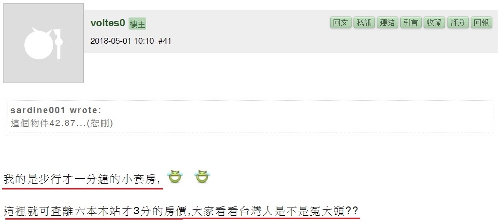 linext wrote:親身證明你又不信,你去買阿~~~!不懂就安靜,別像機器人~~~~六本木.....六本木......六本木 鬼打牆,鬼打牆,真是鬼打牆!我們討論的物件只有六本木步行1分鐘的小套房,你不要再鬼打牆了,六本木的房子你買了嗎?還親身證明了?!證明什麼?為什麼叫我去買?你不是說樓主買貴了,同樣的條件下,300萬以下的小套房證明來看看!