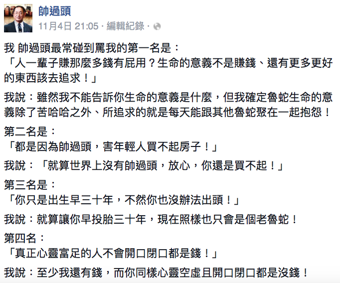 2227995 wrote:年輕人:很多人都買不起房子,你卻有500間房子被套牢,你這樣對嗎?投資客:我被套牢是我的事,你買不起是你家的事 不知道了2016Q4的現在....是放銀行帳戶裡的錢會咬人 還是名下的投資房和商品房會咬人