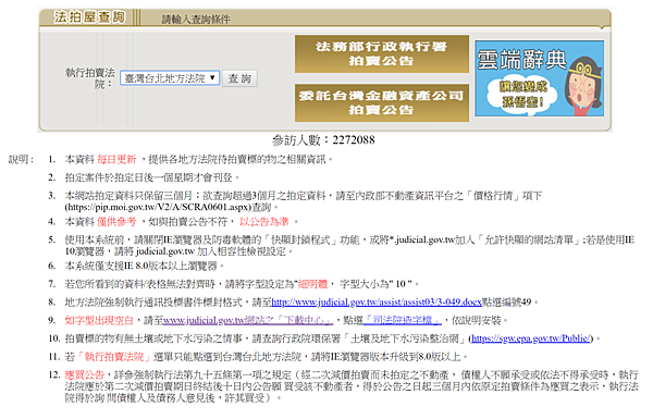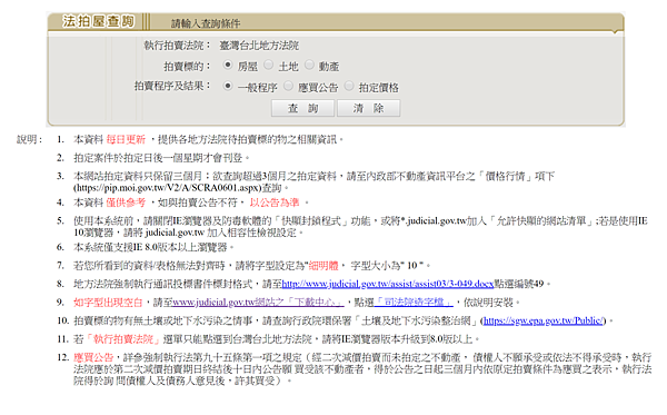1.進入司法院法拍屋公告首頁,請選擇執行拍賣法院,如不知道哪個法院拍賣請點我
