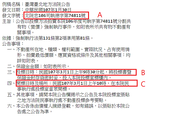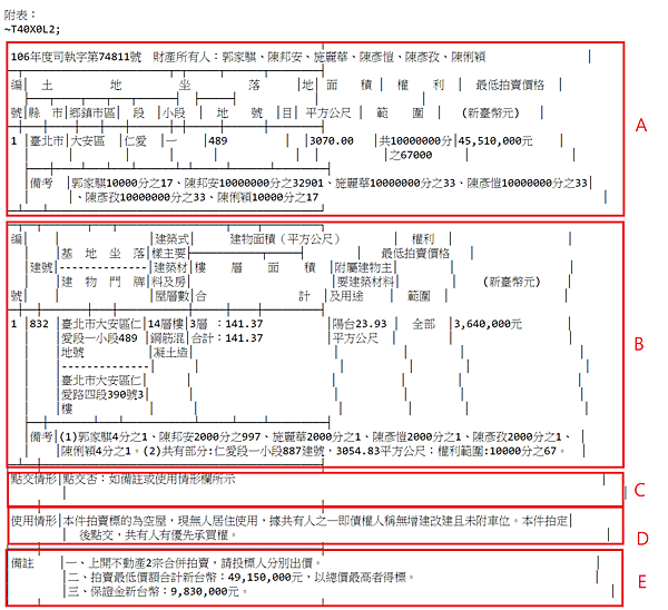 A.【土地標示面積及價格】B.【建物標示面積及價格】 C.【點交情形】D.【使用情形與法院筆錄】E.【拍賣底價及保證金】