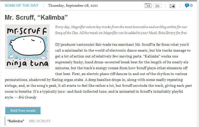 擁有Music Beta帳號的朋友 ,有注意到Music Beta發表了一個新的音樂網站了嗎?Google為了讓大家愛上Music Beta,特別開發了一個Magnifier的歌曲網站,在Magnifier中,可以找到最新由Google 提供的免費音樂,可直接點擊Addfree music上傳到你的Music Beta資料庫,參考圖文:http://yes2android.blogspot.com/2011/09/music-beta-magnifier.html#more