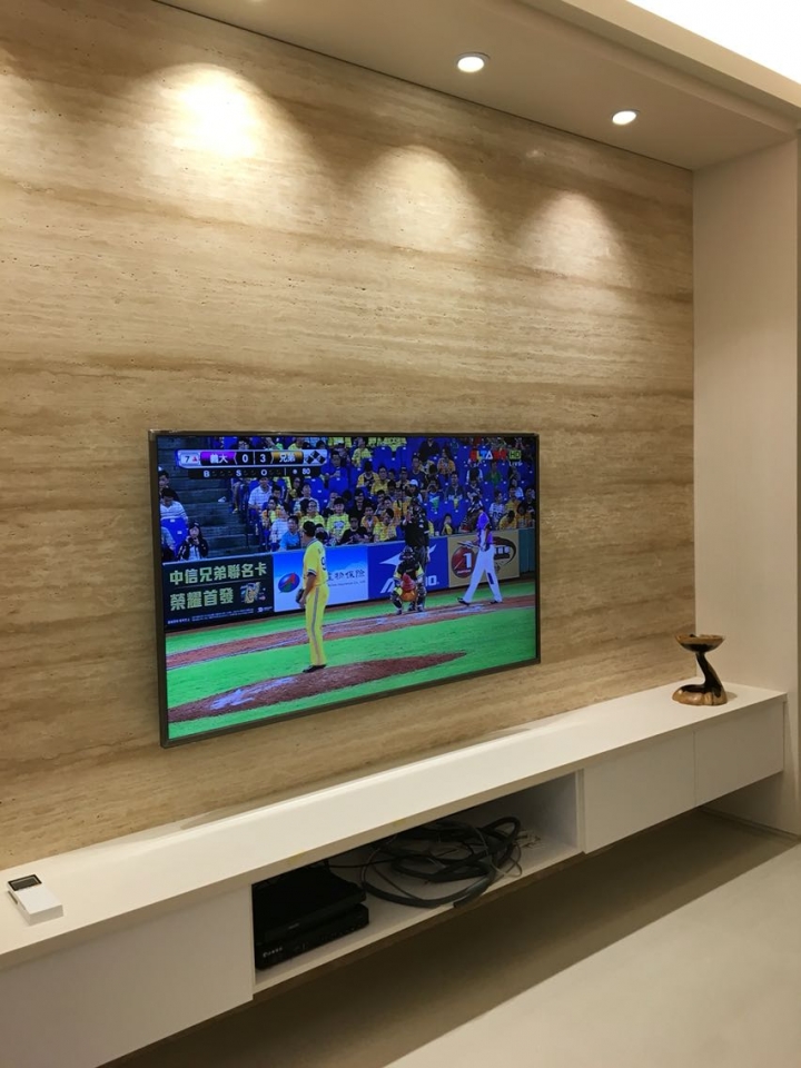 電視因為是大理石牆面壁掛,所以前一天家電先來做記號,隔天中午大理石來鑽洞(術業有專攻),下午再壁掛上去