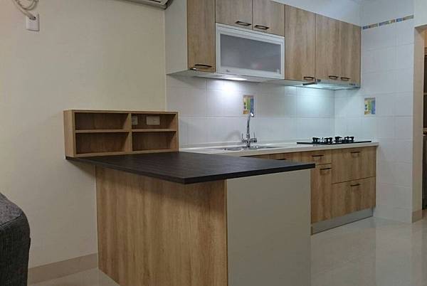原本一樣想要人造石檯面(L型檯面),但因為人造石真的太貴了!所以我們在預算考量範圍內,採取了設計師的提議,後來發現其實這樣也蠻美的,不突兀。
