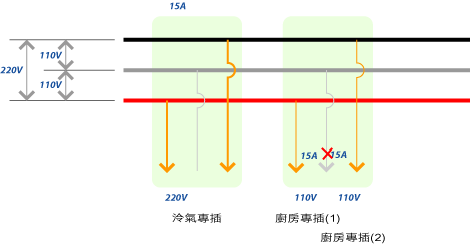 es_mato wrote:其實像泠氣專插一樣;由分電盤拉220V三線到廚房;就可以再拆成兩組110V的專插了 兩組插座使用不同火線時不建議共用中性線.....萬一中性線在插座端接觸不良或脫落時會發生危險,如下圖:共用中性線脫落時這兩組插座成串連狀態,由於兩組插座負載不可能一模一樣,這會造成負載輕的那邊一邊的電器因電壓過高而燒毀....這種狀況在實際案例曾經見過...所以不同迴路最好火線線、中性線各自獨立拉到開關箱比較保險: