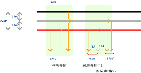 感謝各位前輩的說明,因為在下的問題點之前沒有將狀況說的很清楚,所以重新說明一次,也在麻煩各位前輩幫我指點一下:小弟買了一個新成屋,原先建商規劃的廚房專用插座位置不理想(在一字型的櫥櫃上),所以打算請水電增設插座:目前計畫由電箱空餘的部位追加兩各迴路(2個均為30A的無熔絲開關),廚房電器功率粗估(尚未購入,所以先上網估了一下預計要買的電器功率):微波爐-1300W、烤箱-1300W、電鍋-800W、電子鍋-600W、開飲機-800W,水電師傅跟我說從電箱的無熔絲開關會用5.5mm2的電線拉出來,但是到插座部份因為沒辦法接上插頭,所以會改用2.0mm的電線與插座接。目前經由各位前輩的說明,目前打算施工方式如下:1.電箱內追加兩個30A的無熔絲開關→兩條獨立迴路的5.5mm2電線到廚房→3個專用的5.5mm2的雙聯插座(WTDFP151236),但是我只有兩個獨立迴路,請問我可以將其中一條5.5mm2的電線分接成兩條5.5mm2的電線,再接成1個雙聯插座&1個單插座嗎???2.電箱內追加兩個30A的無熔絲開關→兩條獨立迴路的8mm2電線到廚房→3條5.5mm2的電線(其中一條8mm2分接成兩條5.5mm2)→2個專用的5.5mm2雙聯插座插座(WTDFP151236)&1個5.5mm2單插座。請問哪一種比較好??? 電線分接會有問題嗎??? 分解的方式要用纏繞的還是用壓接套管會比較好???另外由於是由電箱將電源線拉出來時,可以利用電箱裡面的既有的電線塑膠管(裡面已經有電線了)先拉到外面後插座後,再拉進廚房嗎??電源線外面需要有什麼保護嗎??註:目前規劃是以最大功率及會有同一時間一起使用的狀況來計算另剛剛查了一下:WTDFP1512362的15A 125V AC是指一組(2個)插座總共15A嗎??還是一個插座可以承受15A,二個插座可以承受30A ????還有有建議購買的電線廠牌嗎???很抱歉,因為不懂水電,所以問了很多,如果還是有敘述不清楚的地方,請告訴我,我會再追加描述,謝謝各位大大。