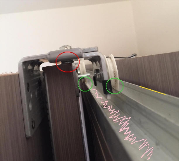 6120 wrote:你的圖,外面那片門要走最右邊那個軌道,你裡面那片門要先裝進軌道,外面那片才裝的進去..(恕刪) 抱歉,有點腦殘~請問您是說,外面的門輪子走在黃色線的位置?還是說..走在凹槽底部下面,像粉紅色那樣的底面?請問上下軌道都要先鎖好嗎?
