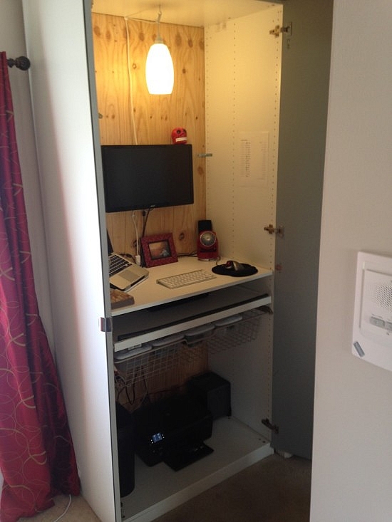 不介意 電腦桌或化妝台 藏在衣櫃裡的話 日本很多這種類似用法上面的空間放層板一樣能儲物不再當電腦桌或化妝台使用時 一樣能回復衣櫃功能不過衣櫃內部需要是系統櫃或IKEA的有留孔 才容易買裡面的五金 一般家具行的無法