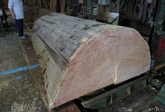 水果狸 wrote:...等了好久..家具終於全部到位...(恕刪) 真的製做了很久...【0506 剖雲杉桌板】先把原木截短到10尺下,因為7~9尺比較好賣左半截~之後剖成神棚板右半截最大寬度6尺~很礙事削成五尺,也順便當作腳 (要立起來剖)吊掛時怕鋼索絞傷木頭,墊片角鐵從邊材漸剖入,來到常用的80cm上~開始取桌板料四尺半寬無法通過砂光機,所以寬度要再裁剪修掉邊材、材鉤造成的傷痕,讓它成等寬板也比較好計算材積抹白膠貼標籤
