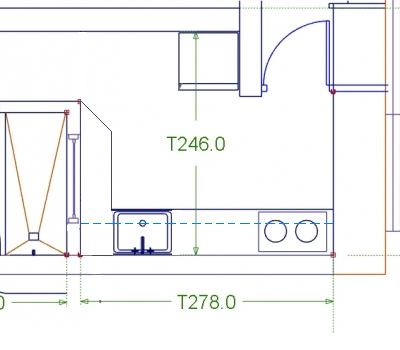 廚房建議配置如下短邊加設40cm淺檯面,襬一個電鍋與一個微坡爐應當足夠,也不用再找地方設電器櫃。廚房入口的檯面切斜邊或圓邊,以免入口太狹窄,也比較美觀,若造型檯面太貴,那直接縮40cm進來也可以,檯面後方的牆記得配插座,吊掛式烘碗機與水槽櫃下淨水器的電源也要先預留好。請注意浴室窗戶的大小與位置,以免卡到廚房吊櫃與烘碗機(圖面藍色虛線),上櫃上方若有足夠空間,可裝設T5燈管提供間接照明,保證燈光美氣氛佳。廚房不要想不開整片貼壁磚啊,這樣就low掉了。若無裝設洗碗機的打算(強烈建議裝,但是你的預算...),長邊下櫃的配置由左至右建議是水槽掀門櫃(35+80),三鋁抽櫃(80),瓦斯爐櫃含兩鋁抽(80),共三個桶身,長度湊起來剛剛好375,五組鋁抽可以收納超多東西。短邊下櫃因為筒身深度只有35cm,作抽屜效益太低,通通做掀門櫃就好。