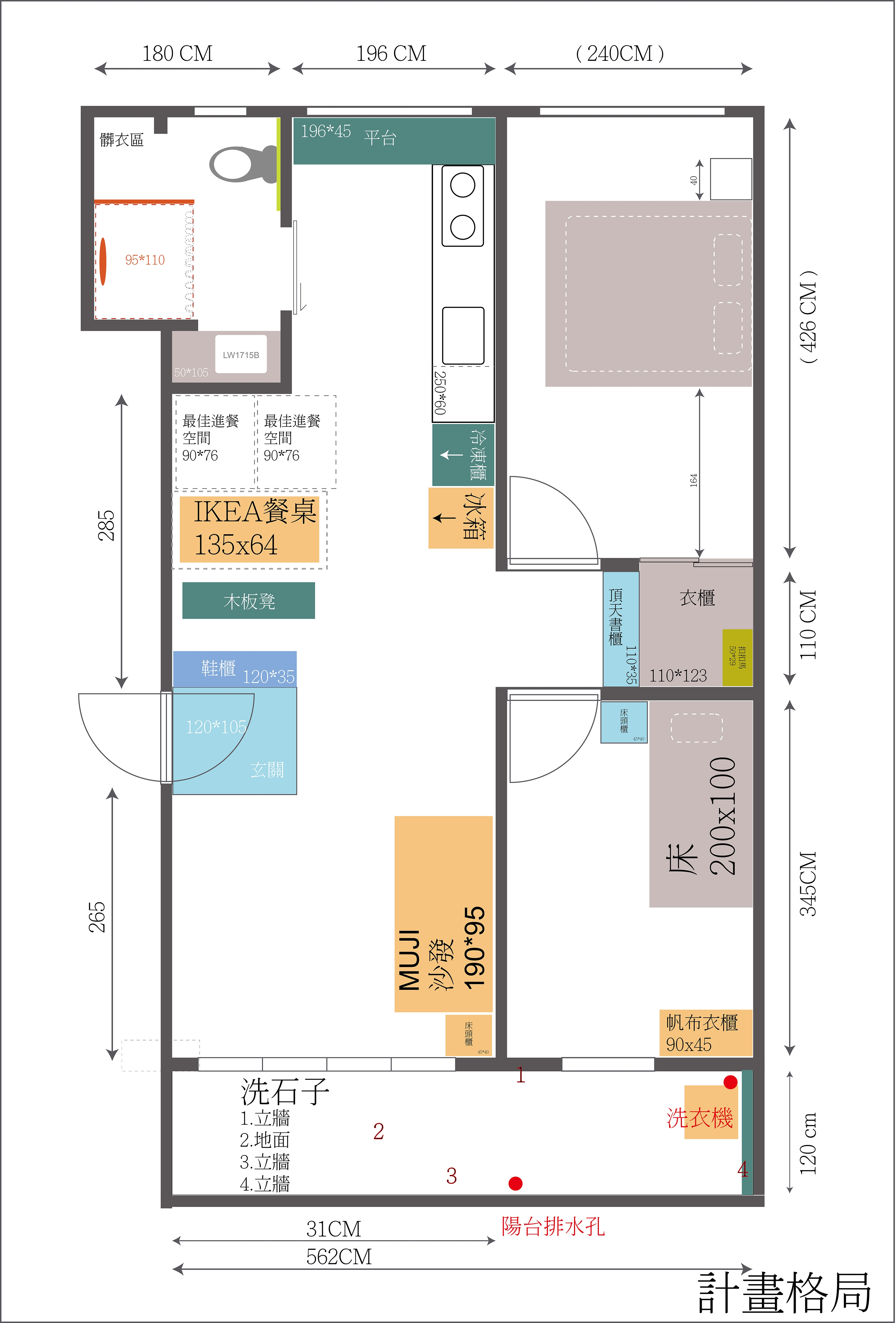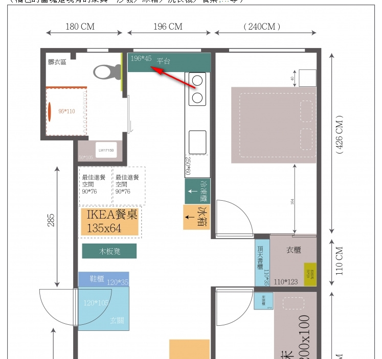 (橘色的圖塊是現有的家具。沙發/冰箱/洗衣機/餐桌,...等)