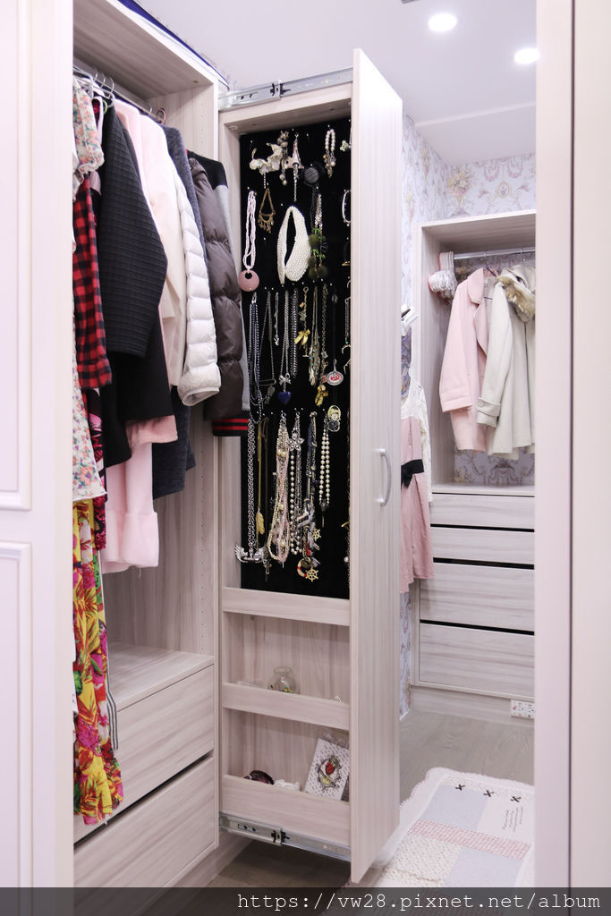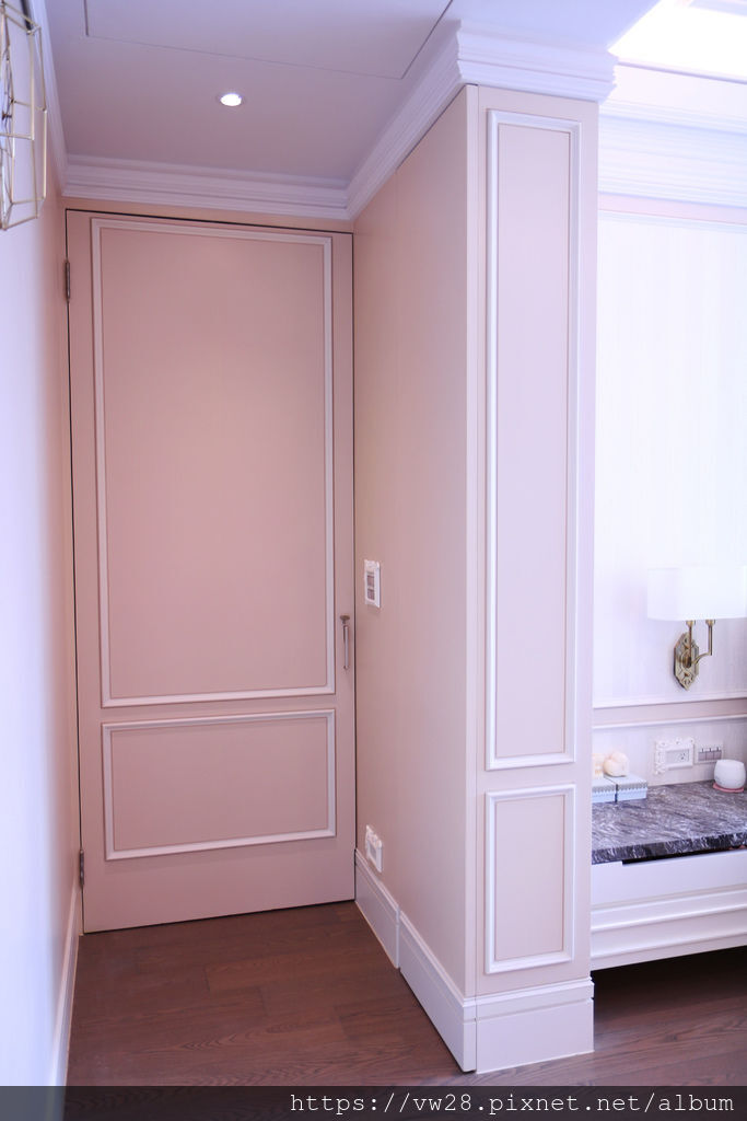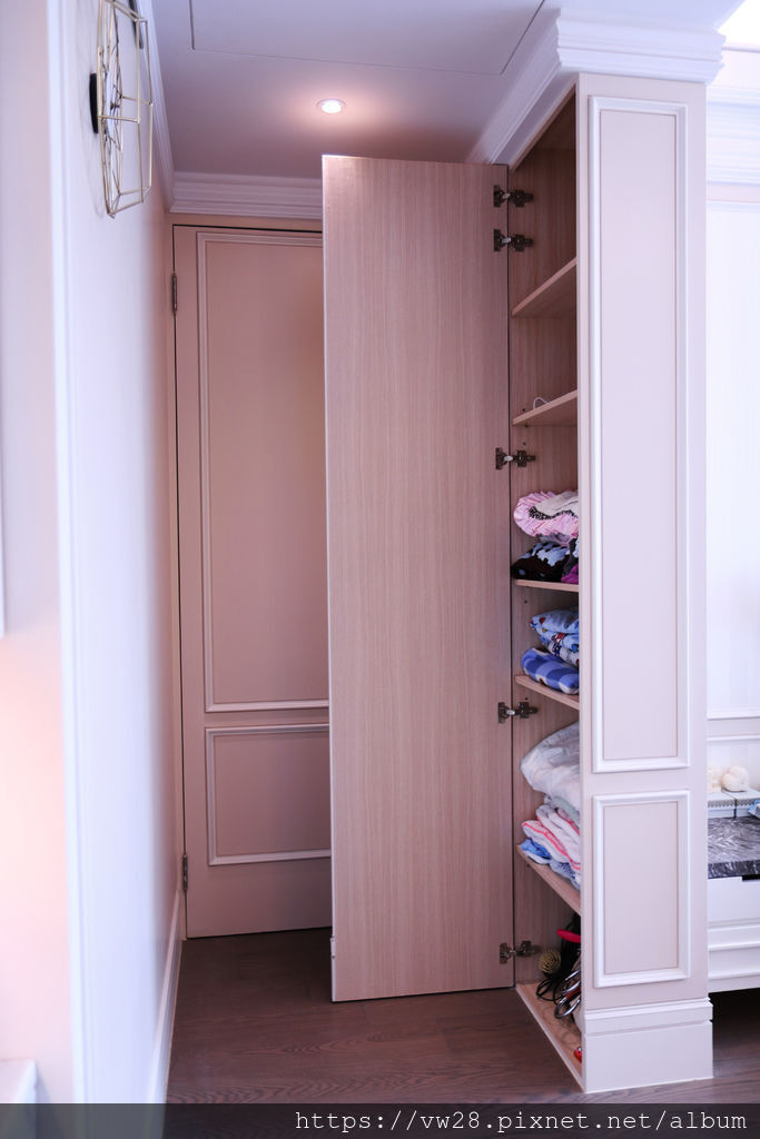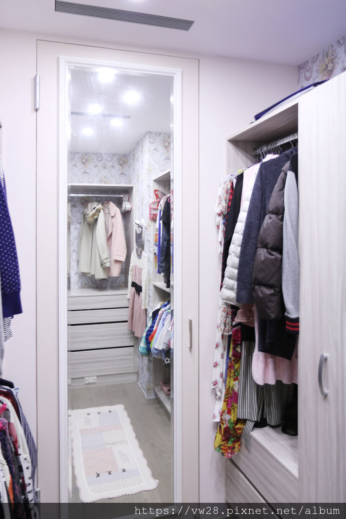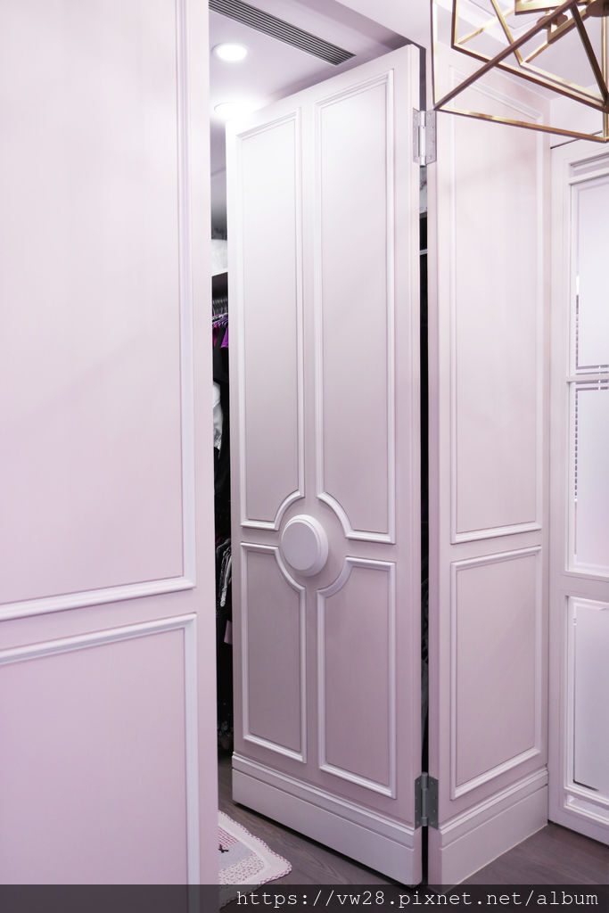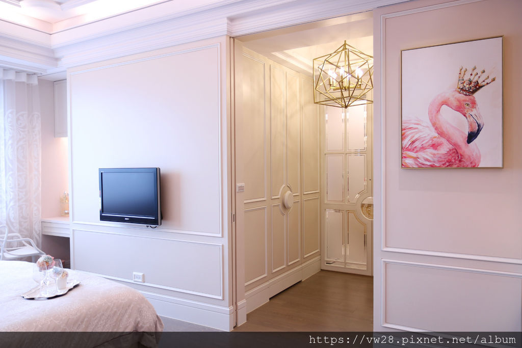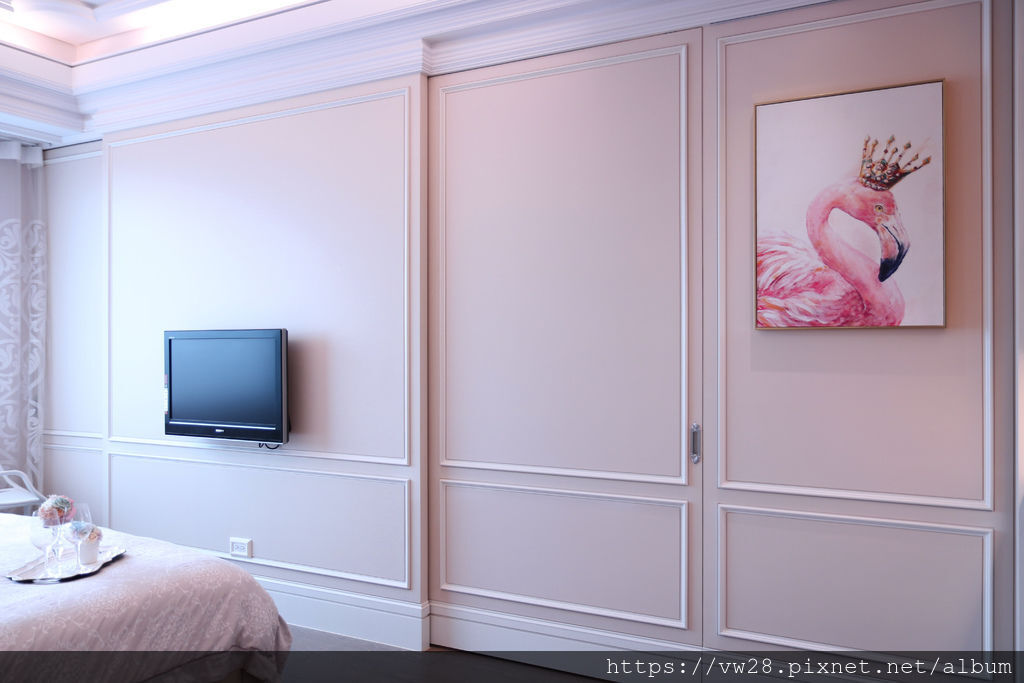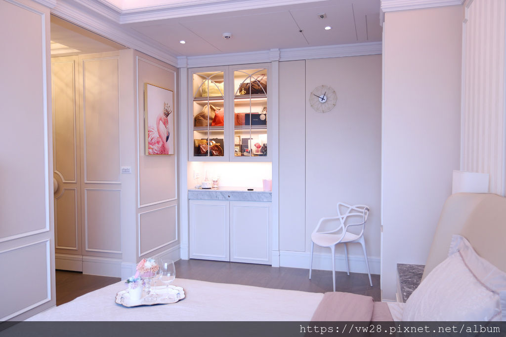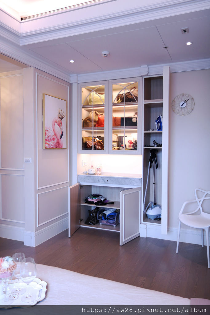 不好意思各位久等啦!!說好的主臥篇終於來了因為本人我身兼數職實在太忙了包含中間這段日子還跑去生小孩 ~哈哈如果需要前情提要可以去看看這三篇玄關篇 客廳篇 書房篇 最近文思泉湧想要再好好的經營一下部落格雖然一直都是三分鐘熱度但還是滿愛自言自語的 那麼我來介紹一下我們的主臥室吧~ 有別於公共空間的藍色新古典氛圍主臥想要走溫和一點的路線走 奶茶粉 的色調(跟 綠茶婊 沒有什麼關係) 這個顏色其實拍照很難表現出來我很認真地拿了單眼出來拍因為不是很會拍加上住在裡面都兩年了整理起來真是要我的命 拍攝不如專業攝影師專業請大家包涵呦~我已經盡量努力拍了 哈哈 一開始在施工的時候油漆師傅調錯了顏色變成比較甜美的粉色我請他們全部重漆才回到本來的奶茶粉事後想想覺得本來的甜美感也不錯啦但覺得如果要看很久的話彩度還是盡量降低比較好 先從大門開始介紹好了我們的主臥室是採取現在流行的二進式也就是要先經過書房才會到達主臥以求主臥的隱密性一般來家裡作客的客人如果不經過引導是無法輕易到達私人空間 以風水來說臥室是主夫妻和諧的搭配粉紅色調的女王火烈鳥圖像增加女主人氣場 (哈哈~就是小三別想給我進來!!) 進入後的右手邊是一個很深的展示櫃 主要是要展示名貴包包用的不過我沒有什麼厲害包包可以展示(我在時尚產業工作反而不太在意流行或名牌這事,好像有點反骨)(入錯行) 下面是放一些可以隨便亂塞的包包或者要放什麼都可以 這個櫃子的尺寸很深寬也可以把層板抽掉放置保險箱 我覺得臥室一定要有一個隨手擺放物品的地方這裡除了可以暫時擺放物件之外還是一個展示手錶或是首飾的空間並加上鎖頭 比較安心一點這邊留有插座除了香氛夜燈之外我還放了安眠降噪機因為這個東西不能放在床頭旁邊(要離床遠一點)所以放在這裡比較剛好 展示櫃本來是更大的但是我覺得不需要那麼大的展示空間側邊就規劃成直立型的暗櫃這邊可以收納長形的立燙機 還有吸塵器當然也要留有櫃內插座這樣子吸塵器在收納的時候也可以充電上面就放各式吸頭,非常方便 因為只能讓門從床頭出入這樣我覺得很沒安全感加上風水上也不適合我就在這裡加上了屏風的設計變成長廊的感覺因為完工之後覺得整個主臥線條有點冷硬所以採用維多莉亞式的開關面板作為點綴讓整個空間瞬間溫柔起來 有了屏風之後,進入房間時人會出現在床上的人腰部以下的位置這樣比較有安全感 這個屏風因為還有有空間所以也做成影藏櫃可以放一些毛巾等物件廊道這裡規劃了掛畫的空間所以留了掛畫軌道因為最近壓力很大有去學了一下油畫特別畫了一張適合房間放的粉色系捕夢網畫起來都很大幅也很重就可以掛在這裡 另外我們的床頭櫃也有經過一些巧思在床頭上方除了有留插頭跟主燈開關之外抽屜裡面也留有插頭身為現代人睡前實在無法不玩一下手機抽屜的特殊造型:凹 可以讓抽屜關起來的時候還是可以一邊充電一邊使用亂亂的線也可以完全看不見左右兩邊都留有一樣的設計而下面的抽屜就一般收納的功能檯面的大理石我們是選用有原石手感的花花的不容易髒摸起來又有回到大自然的感覺(有這麼誇張!?) 背牆是線版+壁紙我覺得我選的好像有點太素了?是不是因為這樣更衣室選了一個花不溜丟的? 再來是房間電視牆這一面廊通往主衛浴設計了一個寬敞的廊道我非常喜歡這個廊道的氛圍不但很有氣勢也讓臥室空間變得開敞明亮 多層次的線版設計搭配圓形把手與衛浴門相互呼應但我覺得如果晚上睡覺時這裡有一個空間又感覺怪怪的所以做了一道隱形拉門讓夜晚睡覺時的空間變得溫馨舒適電視牆的左邊是我的化妝台因為不喜歡關在更衣室裡面化妝的感覺所以將化妝台做在臥室處化妝台通常容易亂亂的如果懶得整理一樣可以把他關起來眼不見為淨 而且重點來啦!!!對於更衣室來說這是一個轉角的畸零空間放在臥室更顯得有效率! 除此之外我又要求再往更衣室推25公分這樣我就有更多的化妝品以及雜物的放置處小小的一個空間變化就多了這麼多的收納功能讓我非常的自豪~覺得好像空間魔法師 哈哈 其實我以前是真的很想念室內設計的~可是現在轉行也來不及了~只能在自己的家裡好好發揮啦 化妝台的鏡面後做了類似間接照明的工法讓化妝台更明亮只是開燈處在上方覺得似乎有點不方便(好懶喔我) 上方還有個收納空間覺得木工師傅很厲害為了讓我好拿取東西做了L型的門片原本鏡面只有拉到160公分高我後來要求拉到185公分以上如果鏡面不夠高豈不是很像在箱子裡面化妝了? 大家在裝潢的時候一定要很注意比例問題喔~在平面圖的時候就要認真的看如果有疑慮就模擬 比一下身邊的牆面尺寸還好我有發現這不是要我的感覺~不然我應該後悔死了~抽屜裡面我有加了插座的設計這樣吹風機吹完就可以直接收在裡面了~(而且說實在我好懶得拔插頭)(到底有多懶)電波導入儀器也是同理~ 每個人家裡電視下方總是莫名有留一個插座我是拿來插空氣清淨機~不過插座露在牆上真的好醜一樣用插座面板裝飾起來天花板這類資料網路上很少所以我們房間頂部的造型也分享一下~這部分是老公決定的!真是有夠多層的 回到我們很有氣勢的廊道設計這裡左邊是我的更衣室右邊是我老公的更衣室 中間的吊燈是去掏寶挑選