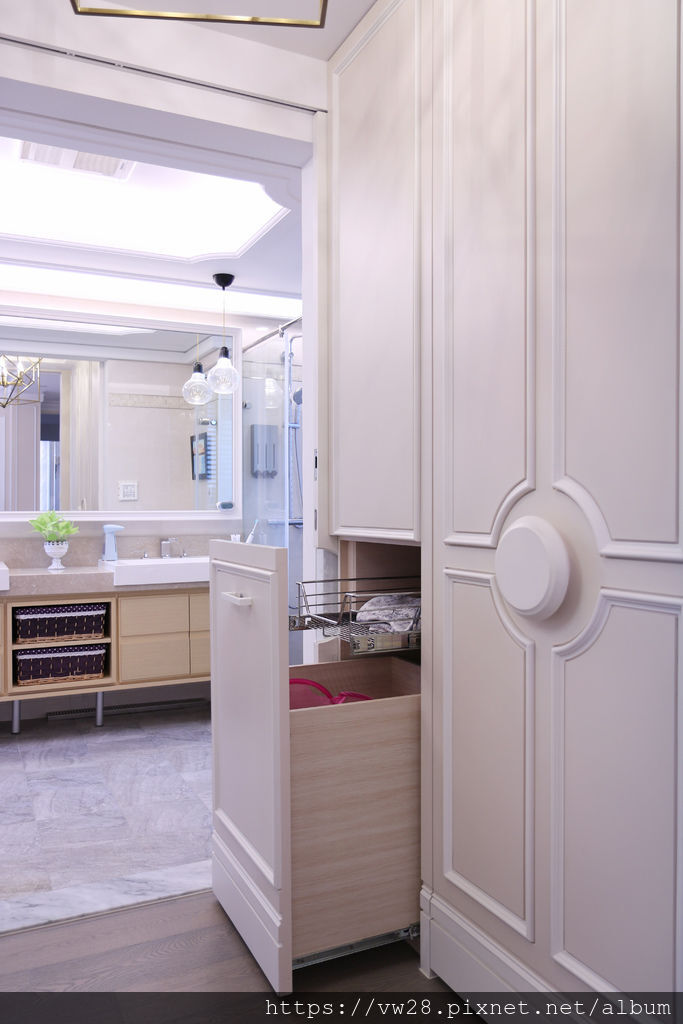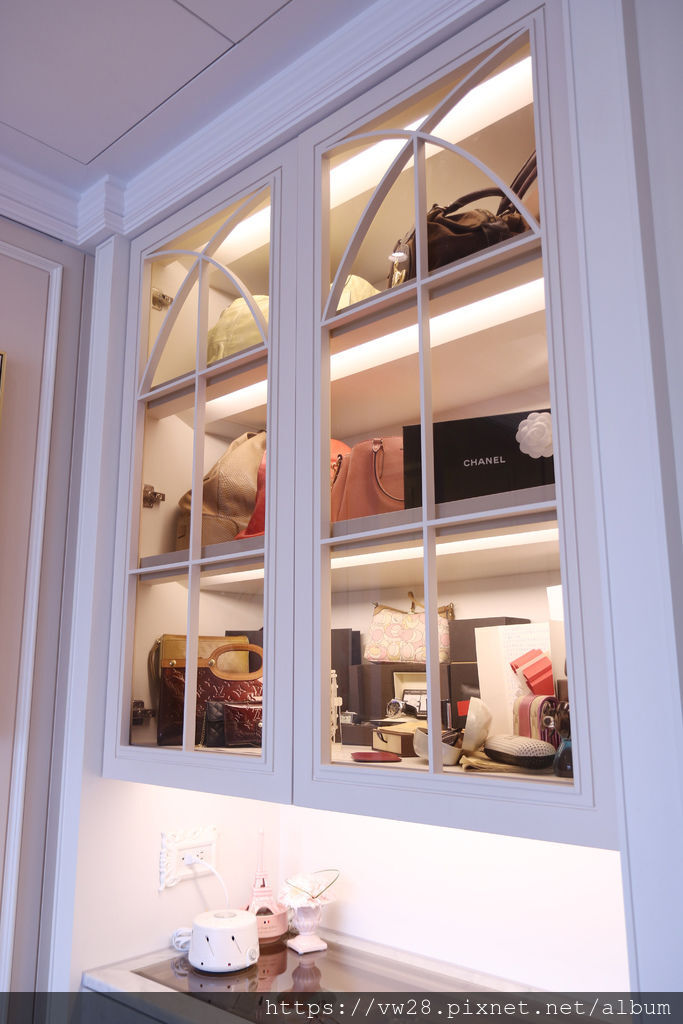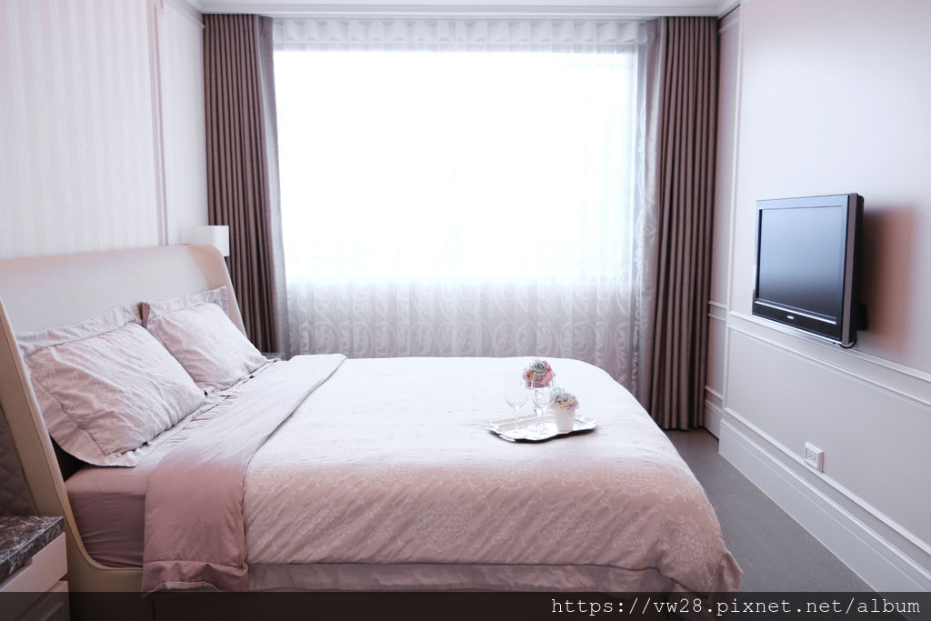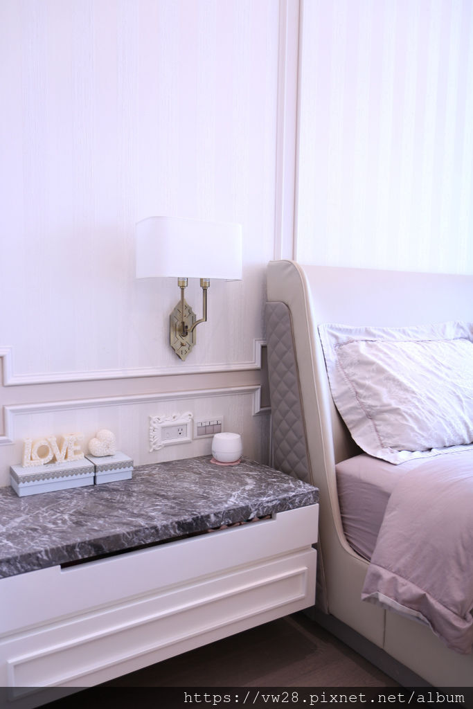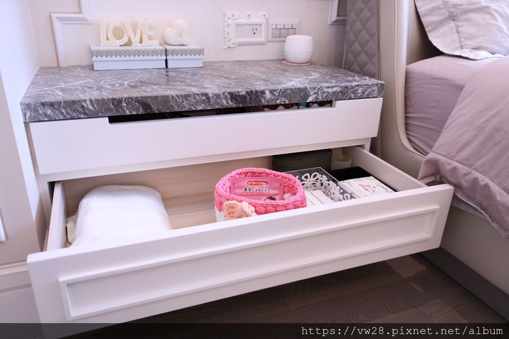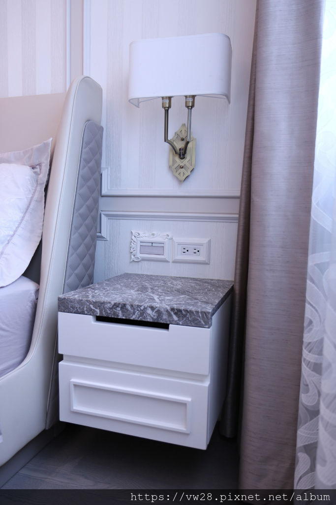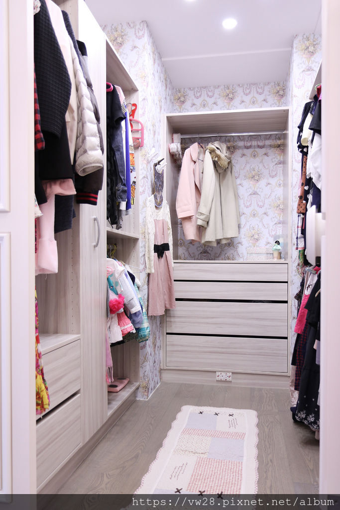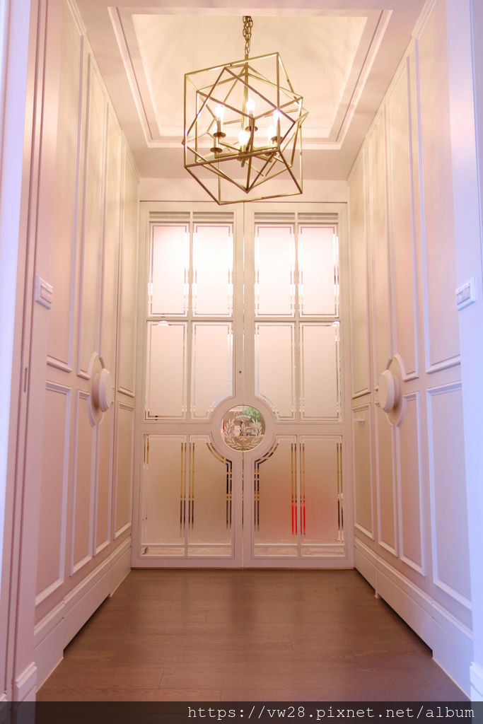 不好意思各位久等啦!!說好的主臥篇終於來了因為本人我身兼數職實在太忙了包含中間這段日子還跑去生小孩 ~哈哈如果需要前情提要可以去看看這三篇玄關篇 客廳篇 書房篇 最近文思泉湧想要再好好的經營一下部落格雖然一直都是三分鐘熱度但還是滿愛自言自語的 那麼我來介紹一下我們的主臥室吧~ 有別於公共空間的藍色新古典氛圍主臥想要走溫和一點的路線走 奶茶粉 的色調(跟 綠茶婊 沒有什麼關係) 這個顏色其實拍照很難表現出來我很認真地拿了單眼出來拍因為不是很會拍加上住在裡面都兩年了整理起來真是要我的命 拍攝不如專業攝影師專業請大家包涵呦~我已經盡量努力拍了 哈哈 一開始在施工的時候油漆師傅調錯了顏色變成比較甜美的粉色我請他們全部重漆才回到本來的奶茶粉事後想想覺得本來的甜美感也不錯啦但覺得如果要看很久的話彩度還是盡量降低比較好 先從大門開始介紹好了我們的主臥室是採取現在流行的二進式也就是要先經過書房才會到達主臥以求主臥的隱密性一般來家裡作客的客人如果不經過引導是無法輕易到達私人空間 以風水來說臥室是主夫妻和諧的搭配粉紅色調的女王火烈鳥圖像增加女主人氣場 (哈哈~就是小三別想給我進來!!) 進入後的右手邊是一個很深的展示櫃 主要是要展示名貴包包用的不過我沒有什麼厲害包包可以展示(我在時尚產業工作反而不太在意流行或名牌這事,好像有點反骨)(入錯行) 下面是放一些可以隨便亂塞的包包或者要放什麼都可以 這個櫃子的尺寸很深寬也可以把層板抽掉放置保險箱 我覺得臥室一定要有一個隨手擺放物品的地方這裡除了可以暫時擺放物件之外還是一個展示手錶或是首飾的空間並加上鎖頭 比較安心一點這邊留有插座除了香氛夜燈之外我還放了安眠降噪機因為這個東西不能放在床頭旁邊(要離床遠一點)所以放在這裡比較剛好 展示櫃本來是更大的但是我覺得不需要那麼大的展示空間側邊就規劃成直立型的暗櫃這邊可以收納長形的立燙機 還有吸塵器當然也要留有櫃內插座這樣子吸塵器在收納的時候也可以充電上面就放各式吸頭,非常方便 因為只能讓門從床頭出入這樣我覺得很沒安全感加上風水上也不適合我就在這裡加上了屏風的設計變成長廊的感覺因為完工之後覺得整個主臥線條有點冷硬所以採用維多莉亞式的開關面板作為點綴讓整個空間瞬間溫柔起來 有了屏風之後,進入房間時人會出現在床上的人腰部以下的位置這樣比較有安全感 這個屏風因為還有有空間所以也做成影藏櫃可以放一些毛巾等物件廊道這裡規劃了掛畫的空間所以留了掛畫軌道因為最近壓力很大有去學了一下油畫特別畫了一張適合房間放的粉色系捕夢網畫起來都很大幅也很重就可以掛在這裡 另外我們的床頭櫃也有經過一些巧思在床頭上方除了有留插頭跟主燈開關之外抽屜裡面也留有插頭身為現代人睡前實在無法不玩一下手機抽屜的特殊造型:凹 可以讓抽屜關起來的時候還是可以一邊充電一邊使用亂亂的線也可以完全看不見左右兩邊都留有一樣的設計而下面的抽屜就一般收納的功能檯面的大理石我們是選用有原石手感的花花的不容易髒摸起來又有回到大自然的感覺(有這麼誇張!?) 背牆是線版+壁紙我覺得我選的好像有點太素了?是不是因為這樣更衣室選了一個花不溜丟的? 再來是房間電視牆這一面廊通往主衛浴設計了一個寬敞的廊道我非常喜歡這個廊道的氛圍不但很有氣勢也讓臥室空間變得開敞明亮 多層次的線版設計搭配圓形把手與衛浴門相互呼應但我覺得如果晚上睡覺時這裡有一個空間又感覺怪怪的所以做了一道隱形拉門讓夜晚睡覺時的空間變得溫馨舒適電視牆的左邊是我的化妝台因為不喜歡關在更衣室裡面化妝的感覺所以將化妝台做在臥室處化妝台通常容易亂亂的如果懶得整理一樣可以把他關起來眼不見為淨 而且重點來啦!!!對於更衣室來說這是一個轉角的畸零空間放在臥室更顯得有效率! 除此之外我又要求再往更衣室推25公分這樣我就有更多的化妝品以及雜物的放置處小小的一個空間變化就多了這麼多的收納功能讓我非常的自豪~覺得好像空間魔法師 哈哈 其實我以前是真的很想念室內設計的~可是現在轉行也來不及了~只能在自己的家裡好好發揮啦 化妝台的鏡面後做了類似間接照明的工法讓化妝台更明亮只是開燈處在上方覺得似乎有點不方便(好懶喔我) 上方還有個收納空間覺得木工師傅很厲害為了讓我好拿取東西做了L型的門片原本鏡面只有拉到160公分高我後來要求拉到185公分以上如果鏡面不夠高豈不是很像在箱子裡面化妝了? 大家在裝潢的時候一定要很注意比例問題喔~在平面圖的時候就要認真的看如果有疑慮就模擬 比一下身邊的牆面尺寸還好我有發現這不是要我的感覺~不然我應該後悔死了~抽屜裡面我有加了插座的設計這樣吹風機吹完就可以直接收在裡面了~(而且說實在我好懶得拔插頭)(到底有多懶)電波導入儀器也是同理~ 每個人家裡電視下方總是莫名有留一個插座我是拿來插空氣清淨機~不過插座露在牆上真的好醜一樣用插座面板裝飾起來天花板這類資料網路上很少所以我們房間頂部的造型也分享一下~這部分是老公決定的!真是有夠多層的 回到我們很有氣勢的廊道設計這裡左邊是我的更衣室右邊是我老公的更衣室 中間的吊燈是去掏寶挑選