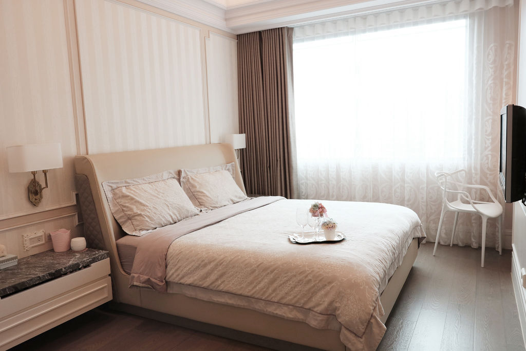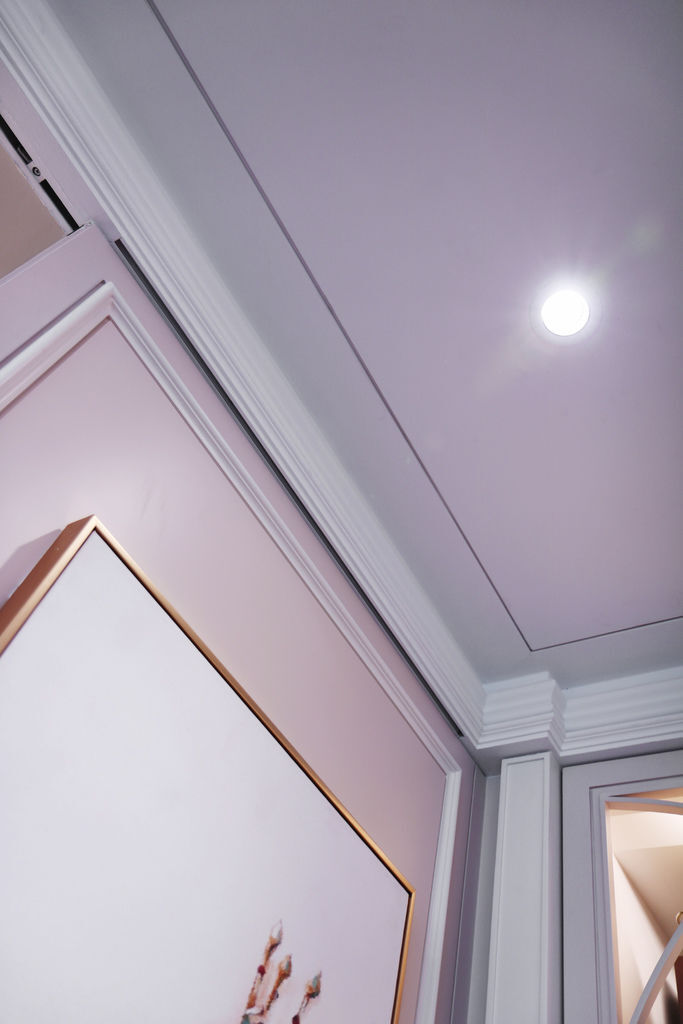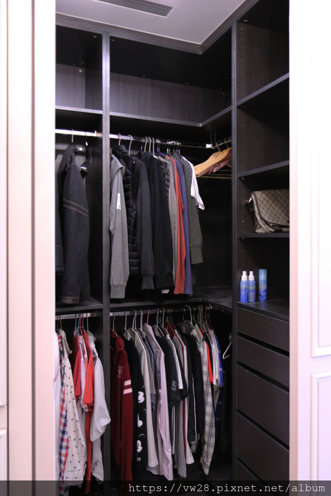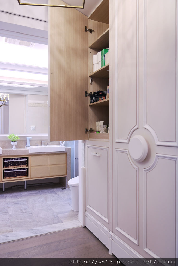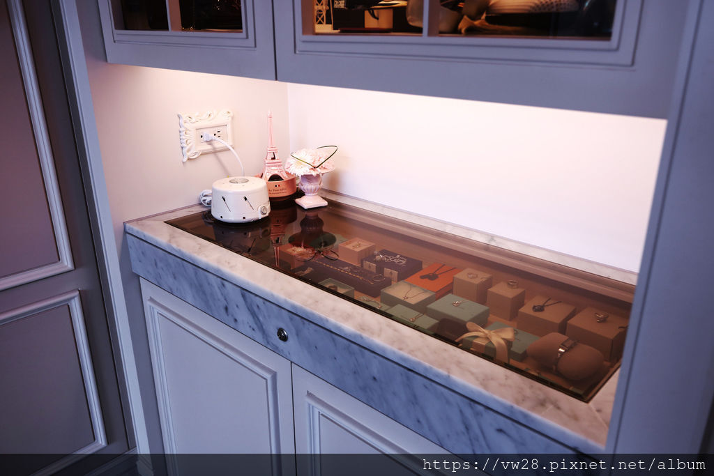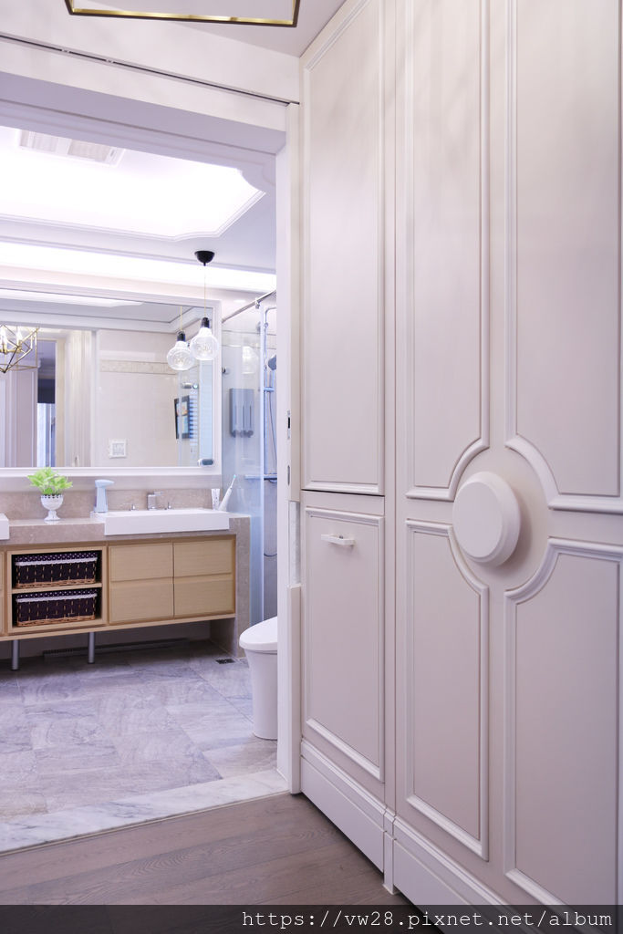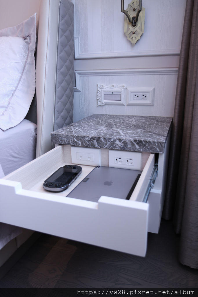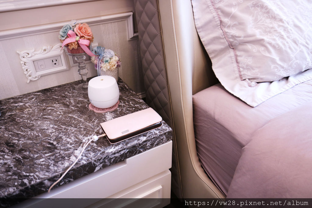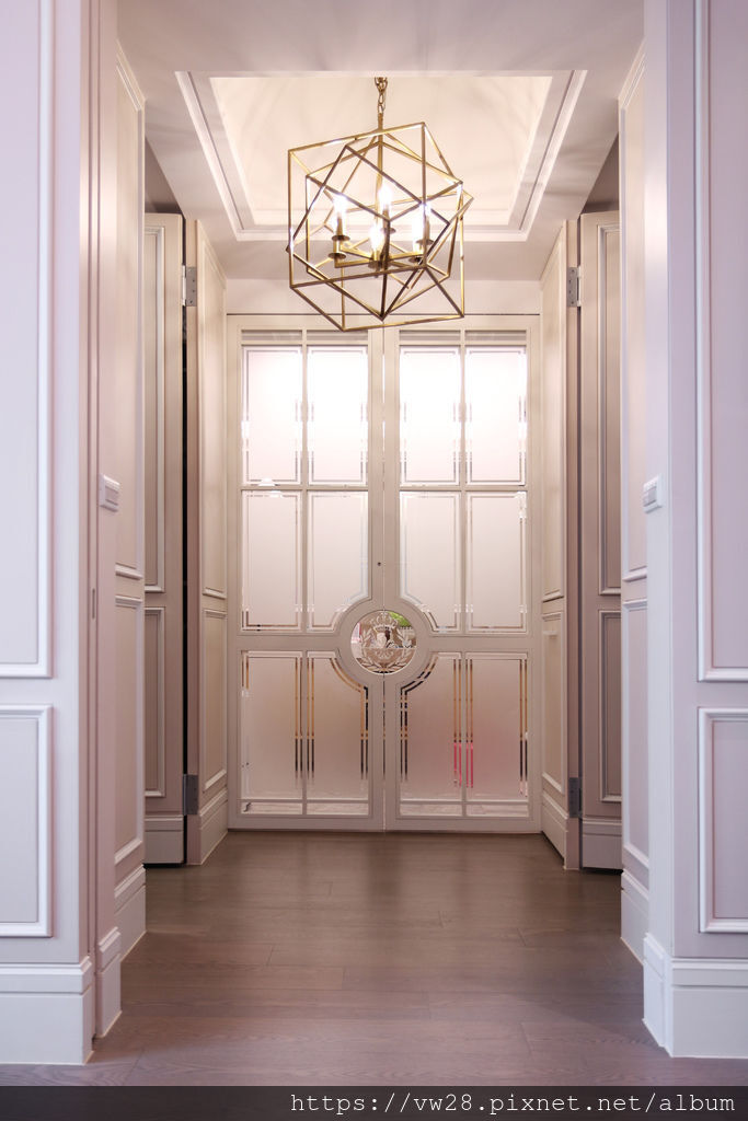 不好意思各位久等啦!!說好的主臥篇終於來了因為本人我身兼數職實在太忙了包含中間這段日子還跑去生小孩 ~哈哈如果需要前情提要可以去看看這三篇玄關篇 客廳篇 書房篇 最近文思泉湧想要再好好的經營一下部落格雖然一直都是三分鐘熱度但還是滿愛自言自語的 那麼我來介紹一下我們的主臥室吧~ 有別於公共空間的藍色新古典氛圍主臥想要走溫和一點的路線走 奶茶粉 的色調(跟 綠茶婊 沒有什麼關係) 這個顏色其實拍照很難表現出來我很認真地拿了單眼出來拍因為不是很會拍加上住在裡面都兩年了整理起來真是要我的命 拍攝不如專業攝影師專業請大家包涵呦~我已經盡量努力拍了 哈哈 一開始在施工的時候油漆師傅調錯了顏色變成比較甜美的粉色我請他們全部重漆才回到本來的奶茶粉事後想想覺得本來的甜美感也不錯啦但覺得如果要看很久的話彩度還是盡量降低比較好 先從大門開始介紹好了我們的主臥室是採取現在流行的二進式也就是要先經過書房才會到達主臥以求主臥的隱密性一般來家裡作客的客人如果不經過引導是無法輕易到達私人空間 以風水來說臥室是主夫妻和諧的搭配粉紅色調的女王火烈鳥圖像增加女主人氣場 (哈哈~就是小三別想給我進來!!) 進入後的右手邊是一個很深的展示櫃 主要是要展示名貴包包用的不過我沒有什麼厲害包包可以展示(我在時尚產業工作反而不太在意流行或名牌這事,好像有點反骨)(入錯行) 下面是放一些可以隨便亂塞的包包或者要放什麼都可以 這個櫃子的尺寸很深寬也可以把層板抽掉放置保險箱 我覺得臥室一定要有一個隨手擺放物品的地方這裡除了可以暫時擺放物件之外還是一個展示手錶或是首飾的空間並加上鎖頭 比較安心一點這邊留有插座除了香氛夜燈之外我還放了安眠降噪機因為這個東西不能放在床頭旁邊(要離床遠一點)所以放在這裡比較剛好 展示櫃本來是更大的但是我覺得不需要那麼大的展示空間側邊就規劃成直立型的暗櫃這邊可以收納長形的立燙機 還有吸塵器當然也要留有櫃內插座這樣子吸塵器在收納的時候也可以充電上面就放各式吸頭,非常方便 因為只能讓門從床頭出入這樣我覺得很沒安全感加上風水上也不適合我就在這裡加上了屏風的設計變成長廊的感覺因為完工之後覺得整個主臥線條有點冷硬所以採用維多莉亞式的開關面板作為點綴讓整個空間瞬間溫柔起來 有了屏風之後,進入房間時人會出現在床上的人腰部以下的位置這樣比較有安全感 這個屏風因為還有有空間所以也做成影藏櫃可以放一些毛巾等物件廊道這裡規劃了掛畫的空間所以留了掛畫軌道因為最近壓力很大有去學了一下油畫特別畫了一張適合房間放的粉色系捕夢網畫起來都很大幅也很重就可以掛在這裡 另外我們的床頭櫃也有經過一些巧思在床頭上方除了有留插頭跟主燈開關之外抽屜裡面也留有插頭身為現代人睡前實在無法不玩一下手機抽屜的特殊造型:凹 可以讓抽屜關起來的時候還是可以一邊充電一邊使用亂亂的線也可以完全看不見左右兩邊都留有一樣的設計而下面的抽屜就一般收納的功能檯面的大理石我們是選用有原石手感的花花的不容易髒摸起來又有回到大自然的感覺(有這麼誇張!?) 背牆是線版+壁紙我覺得我選的好像有點太素了?是不是因為這樣更衣室選了一個花不溜丟的? 再來是房間電視牆這一面廊通往主衛浴設計了一個寬敞的廊道我非常喜歡這個廊道的氛圍不但很有氣勢也讓臥室空間變得開敞明亮 多層次的線版設計搭配圓形把手與衛浴門相互呼應但我覺得如果晚上睡覺時這裡有一個空間又感覺怪怪的所以做了一道隱形拉門讓夜晚睡覺時的空間變得溫馨舒適電視牆的左邊是我的化妝台因為不喜歡關在更衣室裡面化妝的感覺所以將化妝台做在臥室處化妝台通常容易亂亂的如果懶得整理一樣可以把他關起來眼不見為淨 而且重點來啦!!!對於更衣室來說這是一個轉角的畸零空間放在臥室更顯得有效率! 除此之外我又要求再往更衣室推25公分這樣我就有更多的化妝品以及雜物的放置處小小的一個空間變化就多了這麼多的收納功能讓我非常的自豪~覺得好像空間魔法師 哈哈 其實我以前是真的很想念室內設計的~可是現在轉行也來不及了~只能在自己的家裡好好發揮啦 化妝台的鏡面後做了類似間接照明的工法讓化妝台更明亮只是開燈處在上方覺得似乎有點不方便(好懶喔我) 上方還有個收納空間覺得木工師傅很厲害為了讓我好拿取東西做了L型的門片原本鏡面只有拉到160公分高我後來要求拉到185公分以上如果鏡面不夠高豈不是很像在箱子裡面化妝了? 大家在裝潢的時候一定要很注意比例問題喔~在平面圖的時候就要認真的看如果有疑慮就模擬 比一下身邊的牆面尺寸還好我有發現這不是要我的感覺~不然我應該後悔死了~抽屜裡面我有加了插座的設計這樣吹風機吹完就可以直接收在裡面了~(而且說實在我好懶得拔插頭)(到底有多懶)電波導入儀器也是同理~ 每個人家裡電視下方總是莫名有留一個插座我是拿來插空氣清淨機~不過插座露在牆上真的好醜一樣用插座面板裝飾起來天花板這類資料網路上很少所以我們房間頂部的造型也分享一下~這部分是老公決定的!真是有夠多層的 回到我們很有氣勢的廊道設計這裡左邊是我的更衣室右邊是我老公的更衣室 中間的吊燈是去掏寶挑選