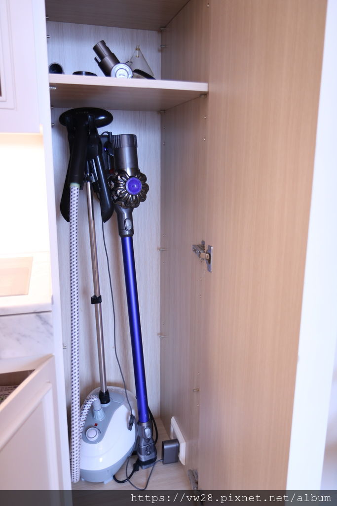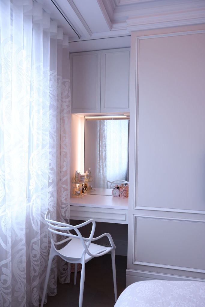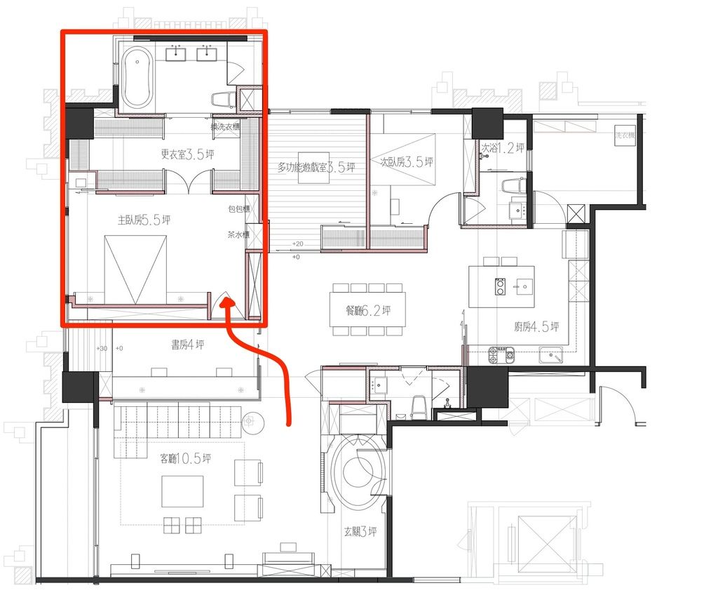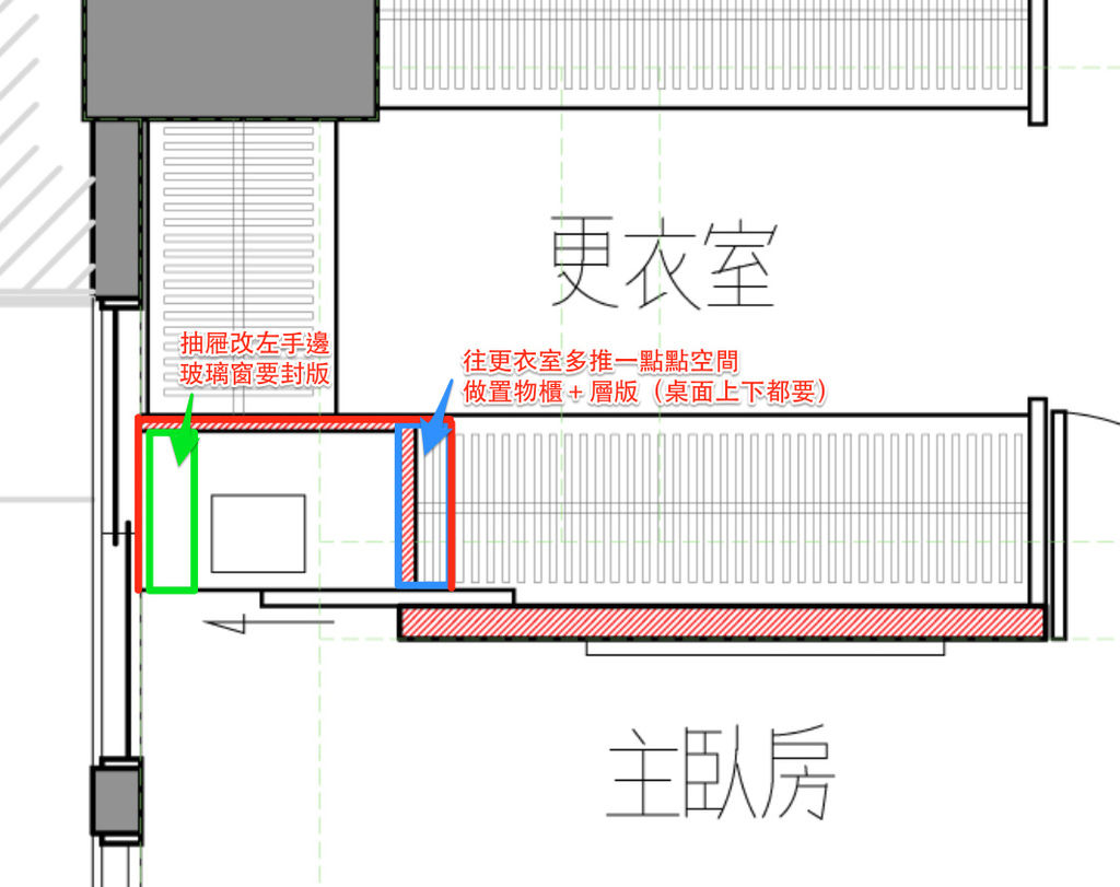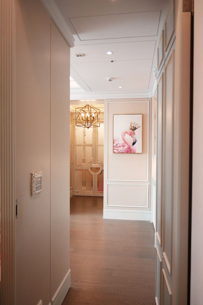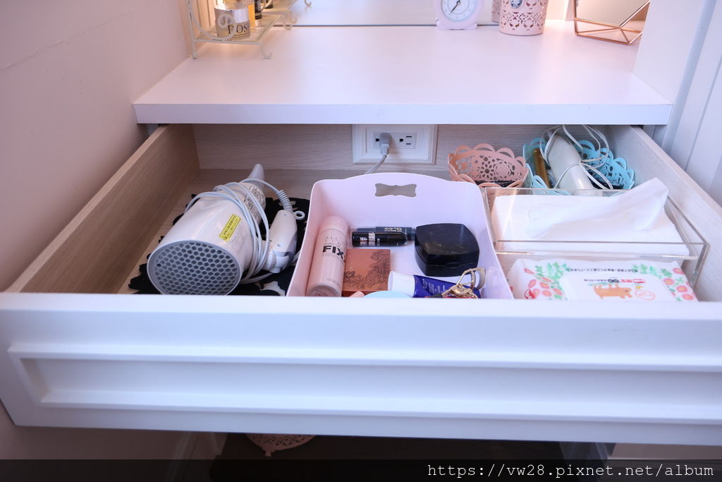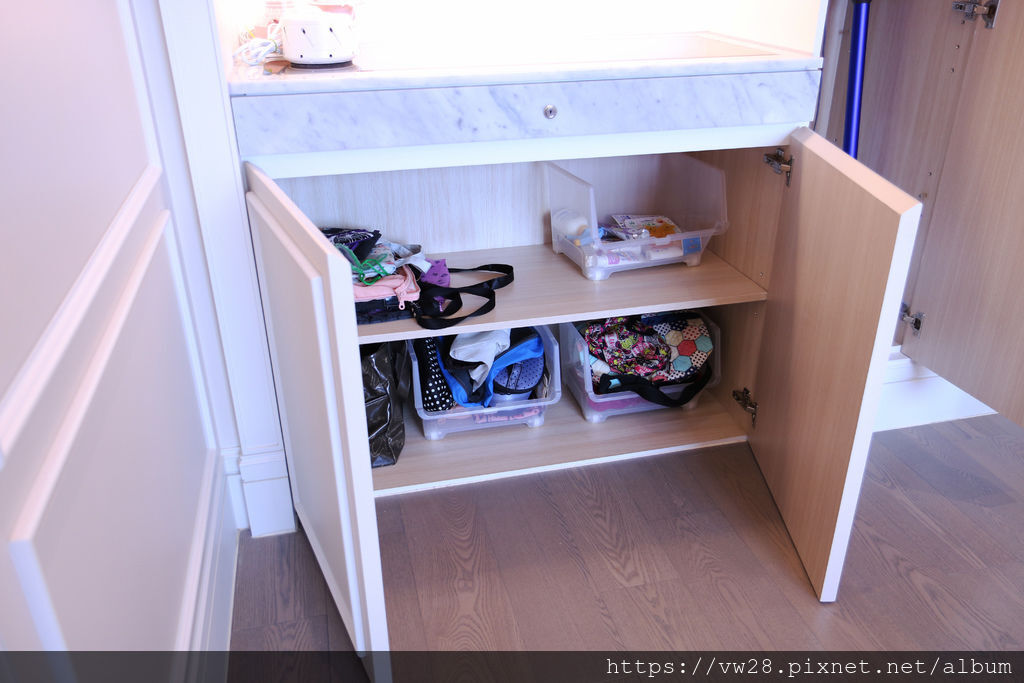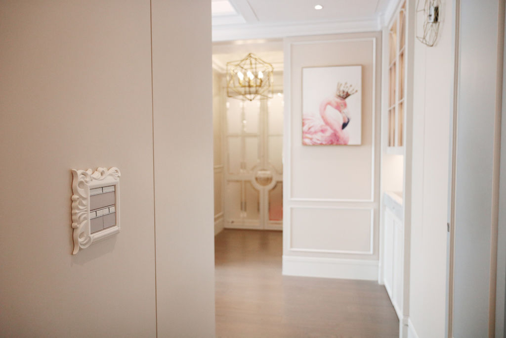 不好意思各位久等啦!!說好的主臥篇終於來了因為本人我身兼數職實在太忙了包含中間這段日子還跑去生小孩 ~哈哈如果需要前情提要可以去看看這三篇玄關篇 客廳篇 書房篇 最近文思泉湧想要再好好的經營一下部落格雖然一直都是三分鐘熱度但還是滿愛自言自語的 那麼我來介紹一下我們的主臥室吧~ 有別於公共空間的藍色新古典氛圍主臥想要走溫和一點的路線走 奶茶粉 的色調(跟 綠茶婊 沒有什麼關係) 這個顏色其實拍照很難表現出來我很認真地拿了單眼出來拍因為不是很會拍加上住在裡面都兩年了整理起來真是要我的命 拍攝不如專業攝影師專業請大家包涵呦~我已經盡量努力拍了 哈哈 一開始在施工的時候油漆師傅調錯了顏色變成比較甜美的粉色我請他們全部重漆才回到本來的奶茶粉事後想想覺得本來的甜美感也不錯啦但覺得如果要看很久的話彩度還是盡量降低比較好 先從大門開始介紹好了我們的主臥室是採取現在流行的二進式也就是要先經過書房才會到達主臥以求主臥的隱密性一般來家裡作客的客人如果不經過引導是無法輕易到達私人空間 以風水來說臥室是主夫妻和諧的搭配粉紅色調的女王火烈鳥圖像增加女主人氣場 (哈哈~就是小三別想給我進來!!) 進入後的右手邊是一個很深的展示櫃 主要是要展示名貴包包用的不過我沒有什麼厲害包包可以展示(我在時尚產業工作反而不太在意流行或名牌這事,好像有點反骨)(入錯行) 下面是放一些可以隨便亂塞的包包或者要放什麼都可以 這個櫃子的尺寸很深寬也可以把層板抽掉放置保險箱 我覺得臥室一定要有一個隨手擺放物品的地方這裡除了可以暫時擺放物件之外還是一個展示手錶或是首飾的空間並加上鎖頭 比較安心一點這邊留有插座除了香氛夜燈之外我還放了安眠降噪機因為這個東西不能放在床頭旁邊(要離床遠一點)所以放在這裡比較剛好 展示櫃本來是更大的但是我覺得不需要那麼大的展示空間側邊就規劃成直立型的暗櫃這邊可以收納長形的立燙機 還有吸塵器當然也要留有櫃內插座這樣子吸塵器在收納的時候也可以充電上面就放各式吸頭,非常方便 因為只能讓門從床頭出入這樣我覺得很沒安全感加上風水上也不適合我就在這裡加上了屏風的設計變成長廊的感覺因為完工之後覺得整個主臥線條有點冷硬所以採用維多莉亞式的開關面板作為點綴讓整個空間瞬間溫柔起來 有了屏風之後,進入房間時人會出現在床上的人腰部以下的位置這樣比較有安全感 這個屏風因為還有有空間所以也做成影藏櫃可以放一些毛巾等物件廊道這裡規劃了掛畫的空間所以留了掛畫軌道因為最近壓力很大有去學了一下油畫特別畫了一張適合房間放的粉色系捕夢網畫起來都很大幅也很重就可以掛在這裡 另外我們的床頭櫃也有經過一些巧思在床頭上方除了有留插頭跟主燈開關之外抽屜裡面也留有插頭身為現代人睡前實在無法不玩一下手機抽屜的特殊造型:凹 可以讓抽屜關起來的時候還是可以一邊充電一邊使用亂亂的線也可以完全看不見左右兩邊都留有一樣的設計而下面的抽屜就一般收納的功能檯面的大理石我們是選用有原石手感的花花的不容易髒摸起來又有回到大自然的感覺(有這麼誇張!?) 背牆是線版+壁紙我覺得我選的好像有點太素了?是不是因為這樣更衣室選了一個花不溜丟的? 再來是房間電視牆這一面廊通往主衛浴設計了一個寬敞的廊道我非常喜歡這個廊道的氛圍不但很有氣勢也讓臥室空間變得開敞明亮 多層次的線版設計搭配圓形把手與衛浴門相互呼應但我覺得如果晚上睡覺時這裡有一個空間又感覺怪怪的所以做了一道隱形拉門讓夜晚睡覺時的空間變得溫馨舒適電視牆的左邊是我的化妝台因為不喜歡關在更衣室裡面化妝的感覺所以將化妝台做在臥室處化妝台通常容易亂亂的如果懶得整理一樣可以把他關起來眼不見為淨 而且重點來啦!!!對於更衣室來說這是一個轉角的畸零空間放在臥室更顯得有效率! 除此之外我又要求再往更衣室推25公分這樣我就有更多的化妝品以及雜物的放置處小小的一個空間變化就多了這麼多的收納功能讓我非常的自豪~覺得好像空間魔法師 哈哈 其實我以前是真的很想念室內設計的~可是現在轉行也來不及了~只能在自己的家裡好好發揮啦 化妝台的鏡面後做了類似間接照明的工法讓化妝台更明亮只是開燈處在上方覺得似乎有點不方便(好懶喔我) 上方還有個收納空間覺得木工師傅很厲害為了讓我好拿取東西做了L型的門片原本鏡面只有拉到160公分高我後來要求拉到185公分以上如果鏡面不夠高豈不是很像在箱子裡面化妝了? 大家在裝潢的時候一定要很注意比例問題喔~在平面圖的時候就要認真的看如果有疑慮就模擬 比一下身邊的牆面尺寸還好我有發現這不是要我的感覺~不然我應該後悔死了~抽屜裡面我有加了插座的設計這樣吹風機吹完就可以直接收在裡面了~(而且說實在我好懶得拔插頭)(到底有多懶)電波導入儀器也是同理~ 每個人家裡電視下方總是莫名有留一個插座我是拿來插空氣清淨機~不過插座露在牆上真的好醜一樣用插座面板裝飾起來天花板這類資料網路上很少所以我們房間頂部的造型也分享一下~這部分是老公決定的!真是有夠多層的 回到我們很有氣勢的廊道設計這裡左邊是我的更衣室右邊是我老公的更衣室 中間的吊燈是去掏寶挑選
