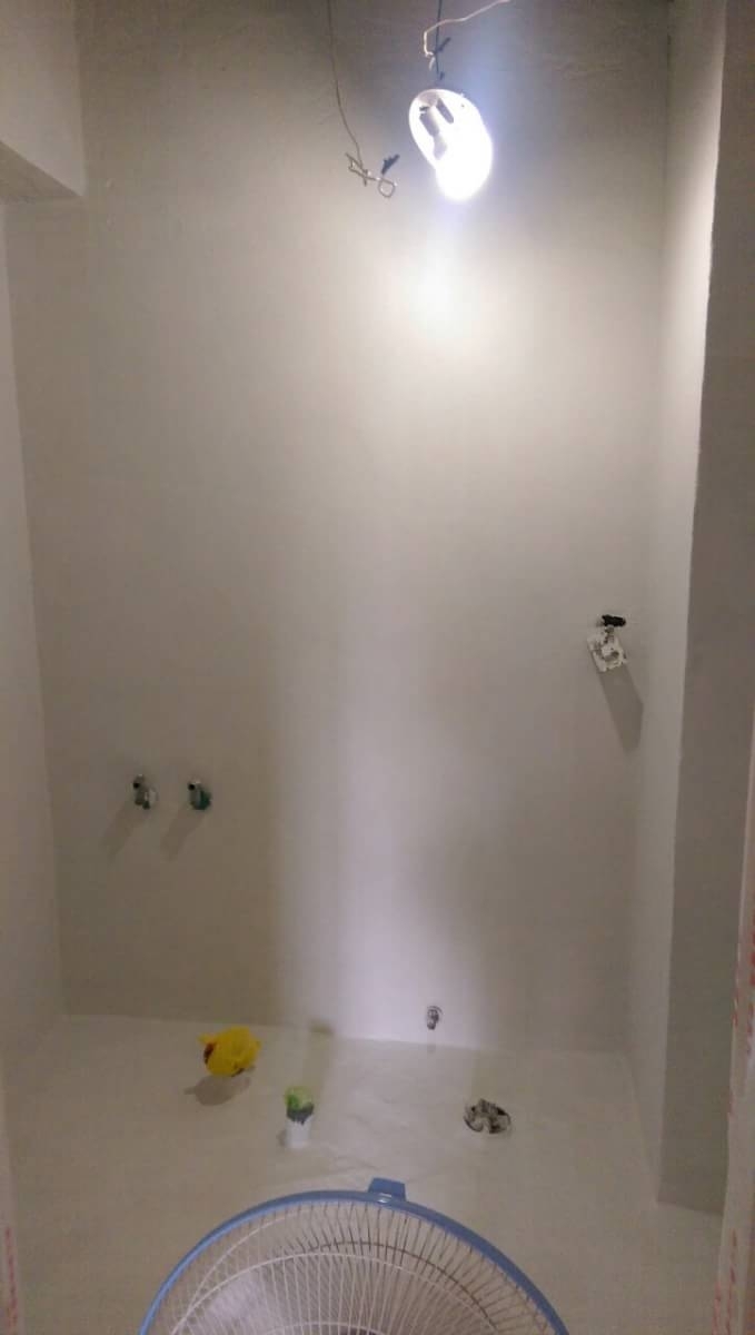 數天後第二次施工,直接在原施工上面鋪上纖維不織布(確切名稱忘記了)再上一層彈泥或防水的東西蓋上去,但牆與地面交接處沒上彈泥,說磁磚會不好鋪及突出(傻眼貓咪,感覺會滲水就是這些位置);並告訴我們他非常用心且仔細處理了,不會再滲水了,請相信專業,況且到時候還會鋪地磚,洩水坡加上地磚用上去絕對防水啦,所以「一直」叫我們不用再試水了;但因為有上次經驗我們堅持要試水,不然地磚都鋪上還漏水,那就不好處理了,所以特地等它乾了兩天(想說第一次測水會不會是因為防水的還不夠乾就測,導致滲水)也就是今天再次試水,試水時間晚上九點多,在剛剛半夜一點多,短短不到五個小時,牆角同樣位置又開始滲水了!!!!