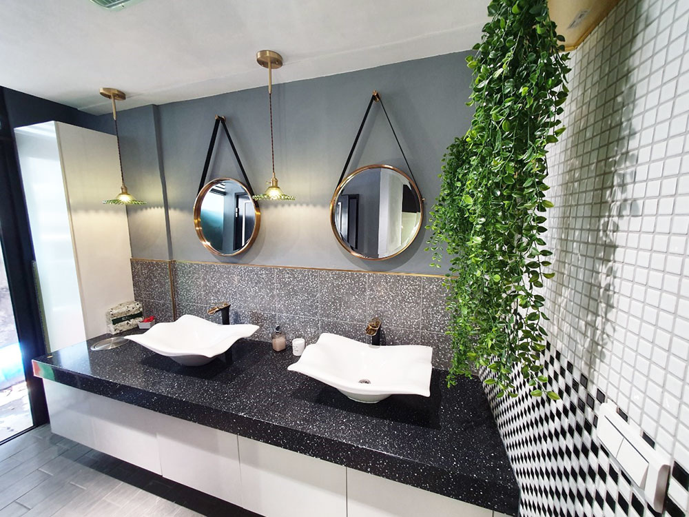 廁所則採用仿古磨石子,風格納入個性鏡面、復古燈具,金屬元素的帶入與前方開放空間前後呼應,增加綠葉的裝飾,營造出自然清新的舒適空間。