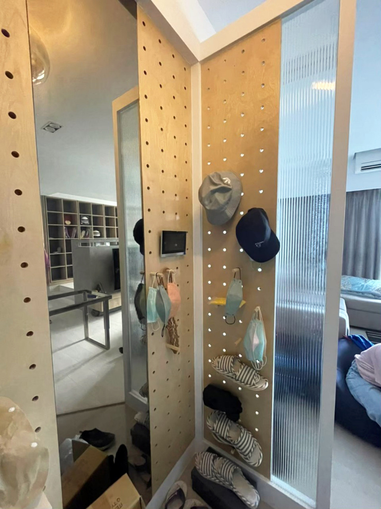 ▼一進門先是玄關的洞洞置物屏風,可以掛鑰匙、掛口罩,也可以調整高度掛外套,上面還嵌入全身鏡,出門前可以整理儀容