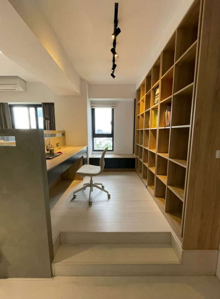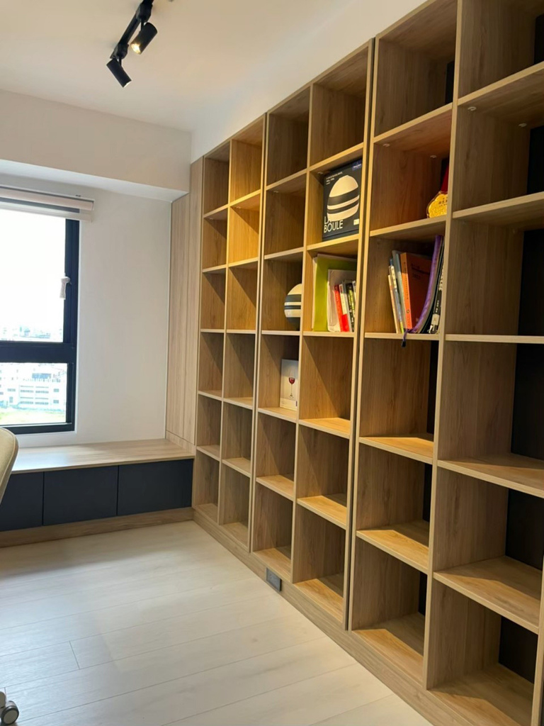 ▼背後是一整面的置物櫃兼書櫃,收納空間做得非常充足。一旁窗戶底下還有臥榻兼收納櫃,早晨或午後時光坐在上面喝杯咖啡、看看閒書,生活多麽愜意,這才是人生啊~