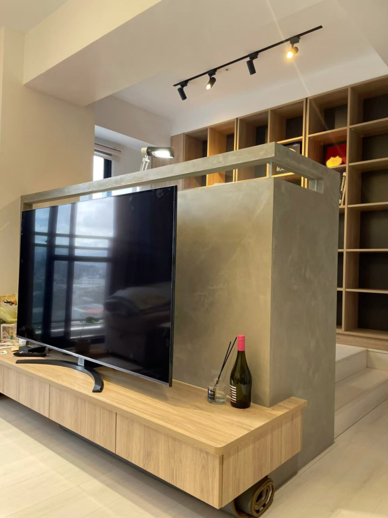 ▼正面看是電視牆,側面看是書桌!我超喜歡這種多功能的系統家具設計,讓住家變得很有趣,還可以讓朋友哇聲連連