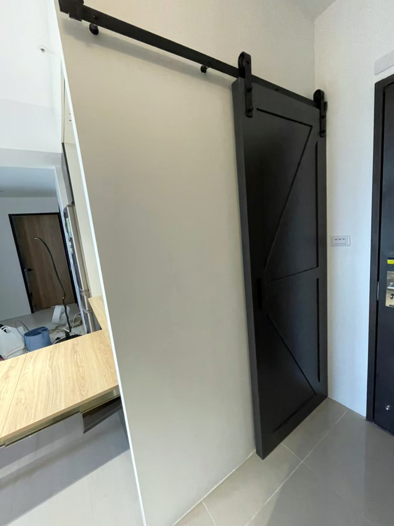 ▼大門另一側裡面是洗手間,捨去傳統的塑膠門改用工業風拉門,設計很好地融合在整個空間裡