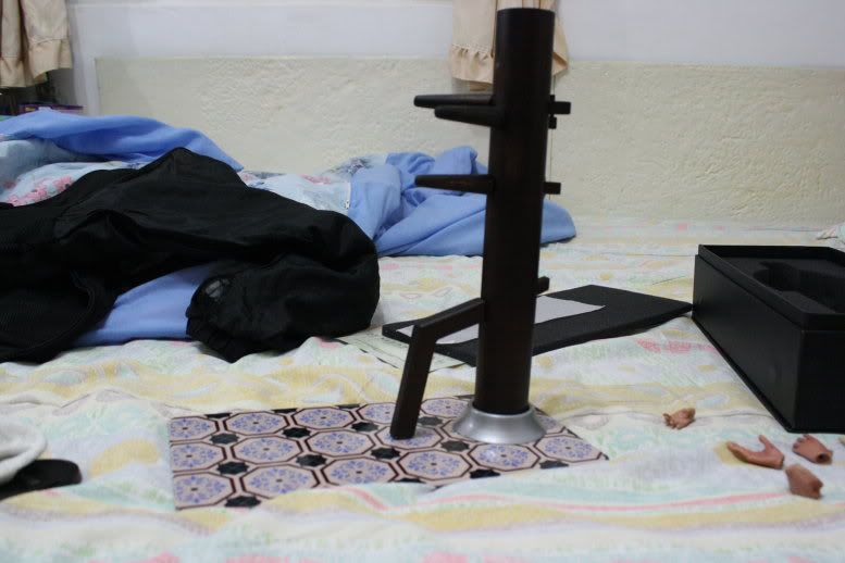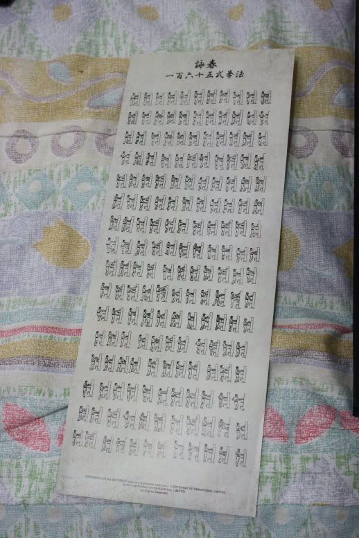 ↓↓↓所付的配備不多,有木樁台,雞毯,還有白上衣及各種手式,另外一張詠春招式圖