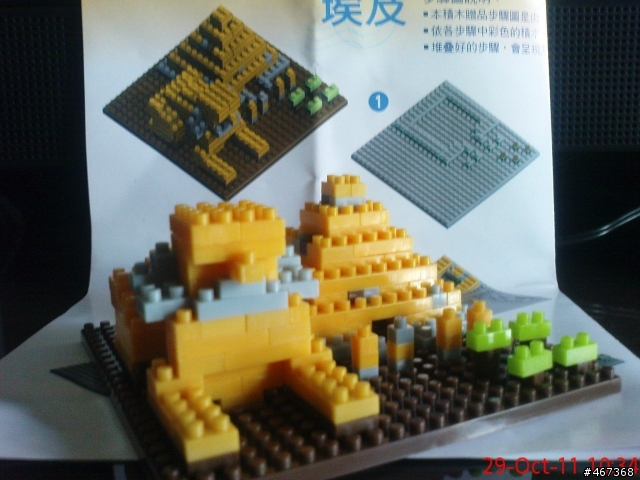 爛歸爛~既然買了還是要把它拼完。昨天晚上拼了埃及金字塔+人面獅身,發現少了五個積木,但多兩個不相干,剛剛到全家拿了短缺的積木,終於完成了~個人覺得第三張的角度比較看得出是啥東西。謝謝~後面還有三個,努力中~~