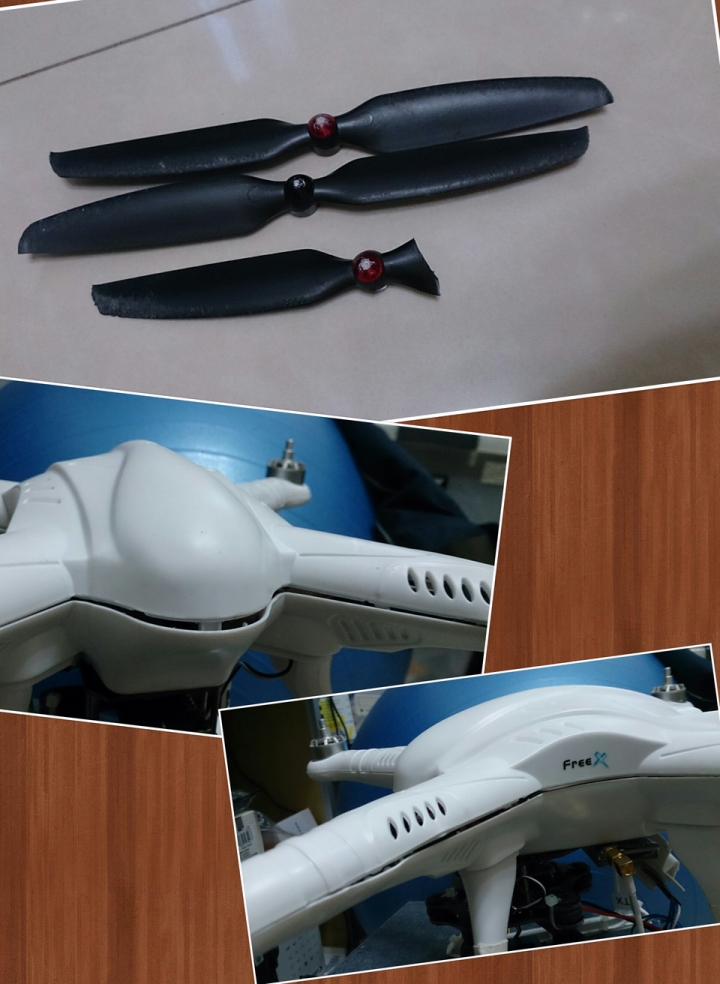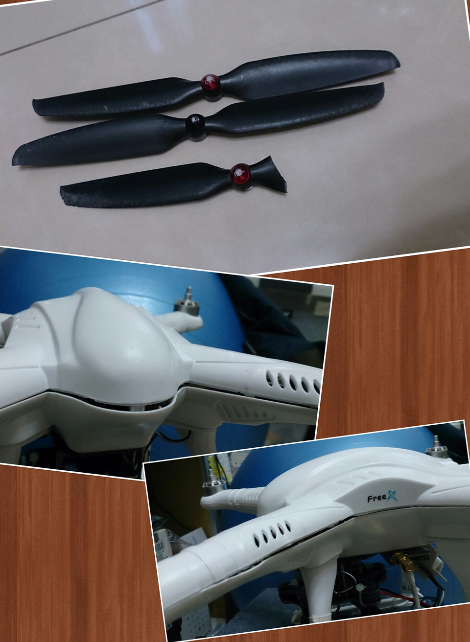 我的FREE X在周六(9/13)失控叛逃了還好(?!)撞上施工中的大樓.得以撿回昨天去了南投很開心的拍了這兩段影片 (技術很差)內湖國小https://www.youtube.com/watch?v=nxEQ0m6aXuM集集水壩https://www.youtube.com/watch?v=-8YxAHgA-m8就在第二段的同地點.換完電池要起飛拍第三趟.一切GPS就失控了.拉也拉不動...直直奔向溪邊......的建築工地.撞上去.確認掉到"地面"之後.我持續關馬達.關了十幾秒才關掉.這部分有點怪不過還好沒直接拜河神.趕快跑過去撿回.慘狀如下一整個正面變超邪惡的...囧.