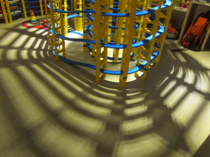 【令人難忘的父親節】女兒跑過來跟我說:「把拔,來看蜘蛛網。」滿臉疑惑的我,轉頭看向她所指的方向。真的是蜘蛛網...原來,她無意間打開了好久沒用的投射燈,把Plarail的軌道映射成了一幅蜘蛛網。「把拔,你看...可可變成蜘蛛了。」我看了好久,終於明白了她的意思。原來,可可變成了火車蜘蛛,她的影子悠遊在那片由軌道構成的蛛網中...「等一下,我來拍張特別的照片。」沒來由的,我突然想要躺下來。顫顫巍巍地...將相機勉強深入擎天雙塔的底部空隙中。喀擦!女兒好奇地伸長了手...也想把她的相機放進去。「把拔,怎麼不行啦...我的相機...」嘟著嘴,像是要哭了出來似的。我連忙抽出了相機,打開了剛拍的照片。「沒關係,把拔拍到了。」「這是甚麼...哇!好漂亮喔...」那是道孿生的月光,照亮了Plarail的軌道。其下的兩張笑靨,沉醉在幸福的光暈中,暈染開來...